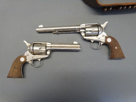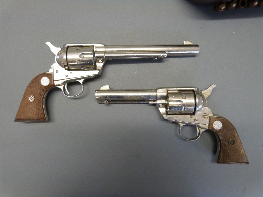 A pair of Colt replica .45 six shot revolvers, one in a leather holster with ammunition belt and replica bullets