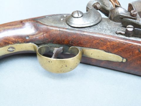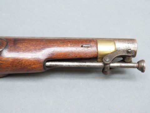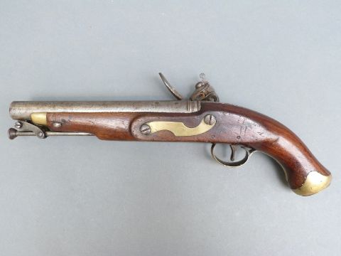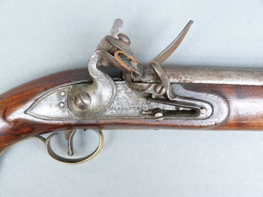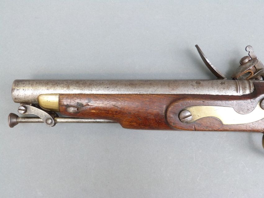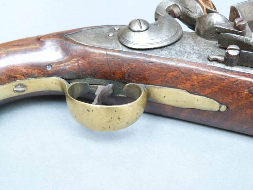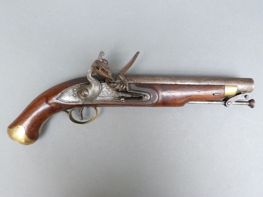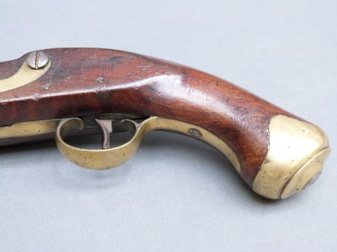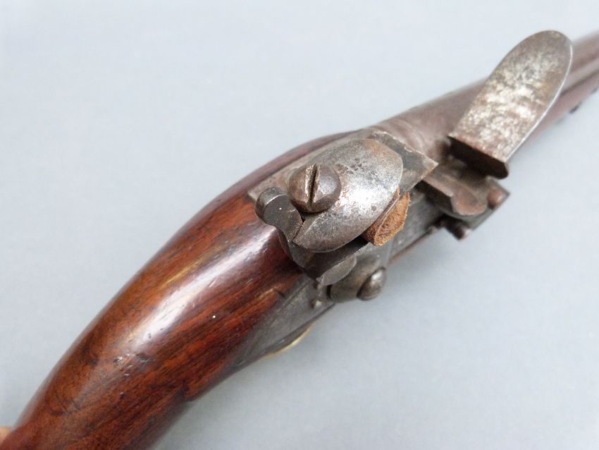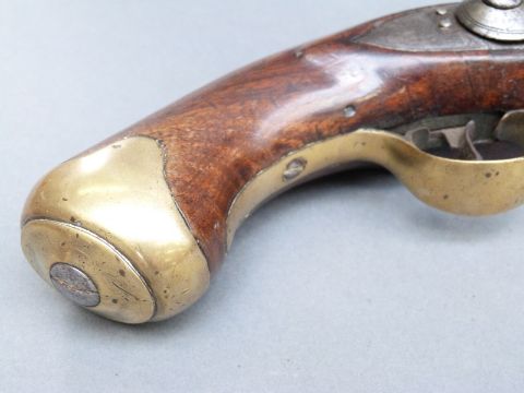 16 bore flintlock hammer action pistol with line engraved lock stamped 'Warrented's', brass trigger guard and butt cap, captive steel ram-rod and 8.8 inch steel smooth bored barrel stamped with proof marks, overall length 40cm