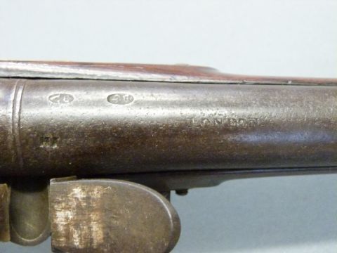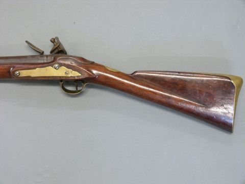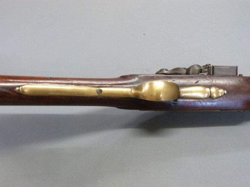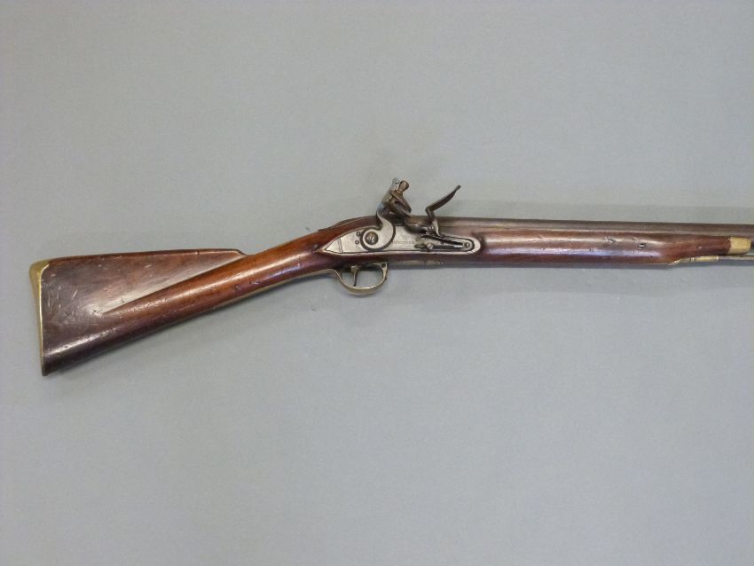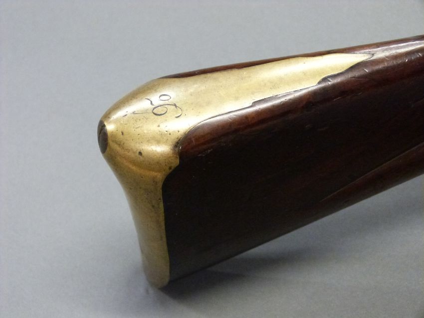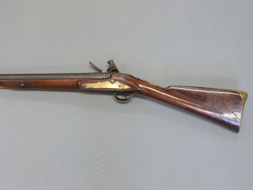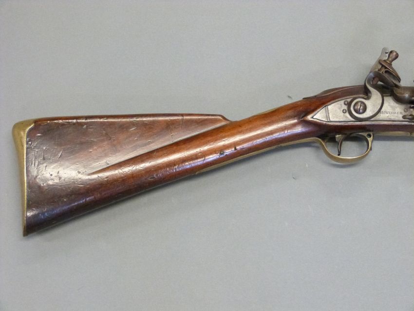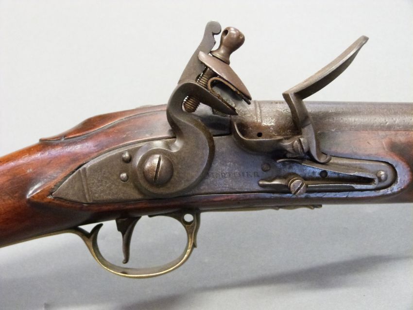 Harvey Walklate Mortimer of London 12 bore flintlock hammer action coaching gun with named lock, brass trigger guard, butt plate, mounts and vacant wrist cartouche, shaped stock, steel ramrod and 19 inch named smooth bored steel barrel, overall length 87cm.