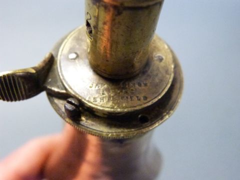James Dixon & Sons copper and brass powder flask with embossed shell decoration to both sides, 20cm long.