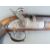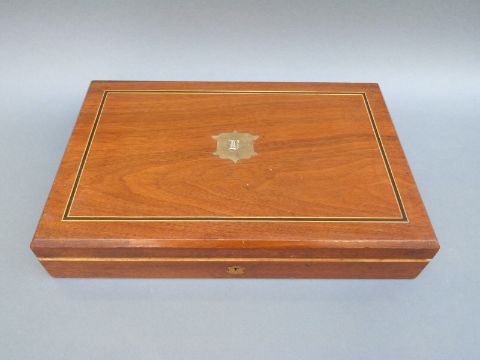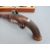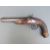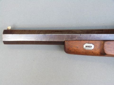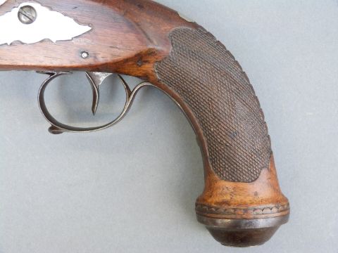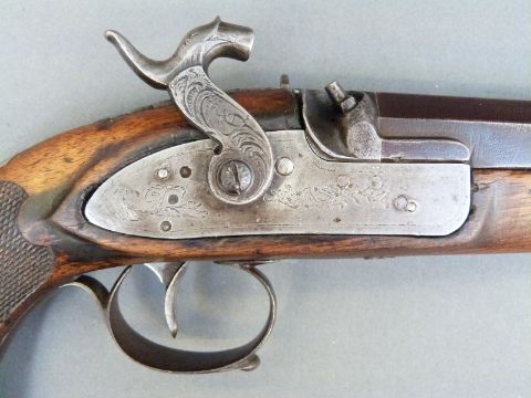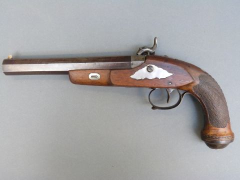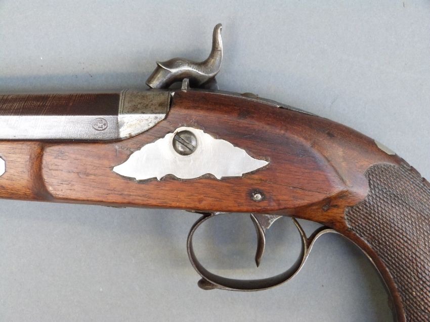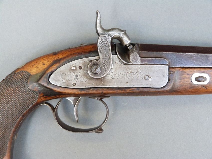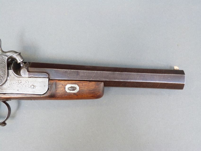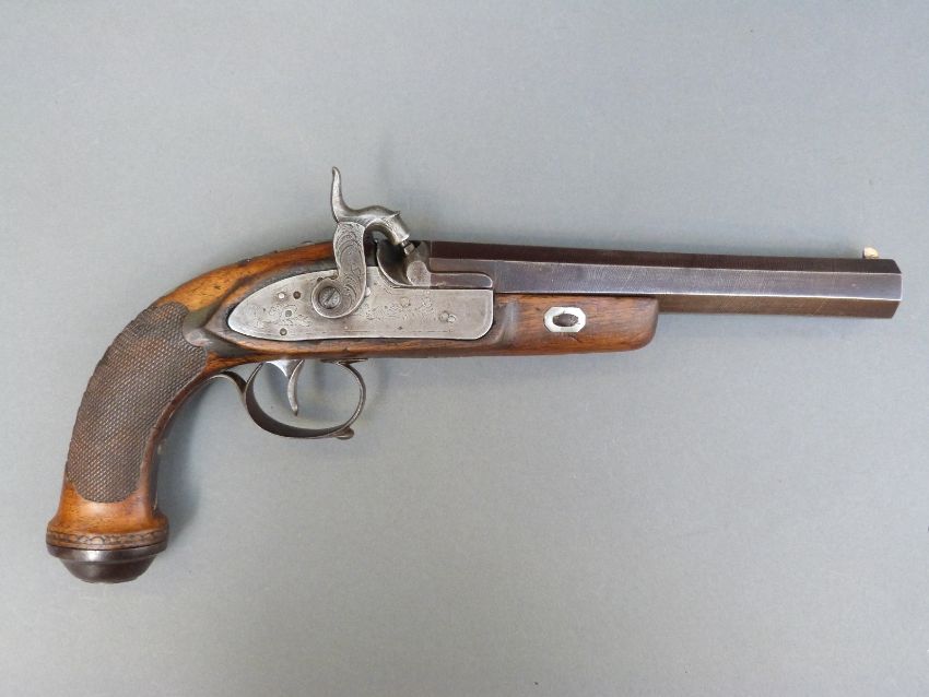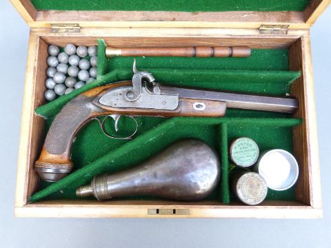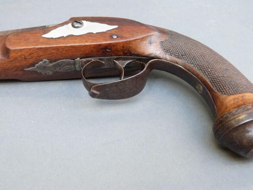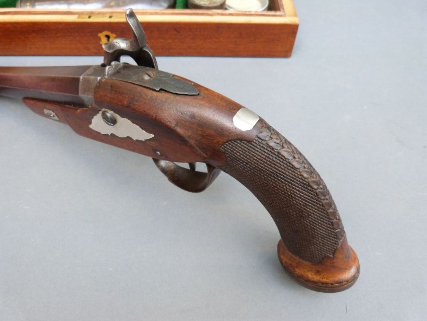 Belgian 16 bore percussion hammer action pistol with engraved lock, stylised dolphin hammer and trigger guard, chequered grip, vacant wrist cartouche, engraved steel butt cap and 7.5 inch octagonal smooth bored Damascus barrel, overall length 36cm, in inlaid fitted inlaid mahogany box with copper and brass powder flask and accessories.