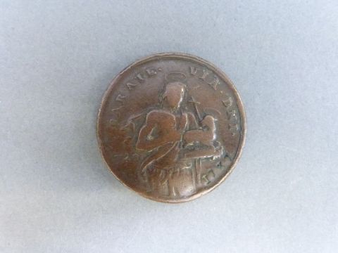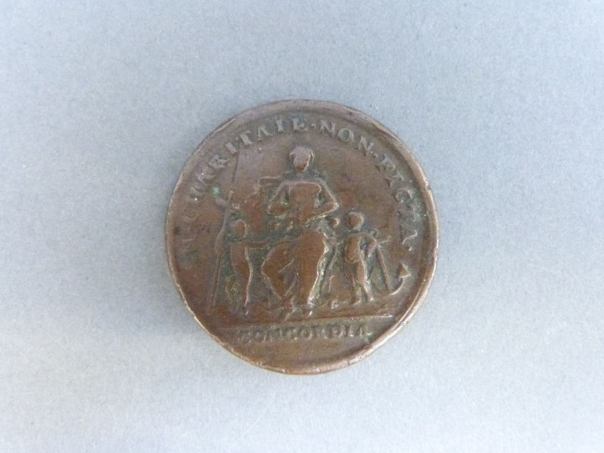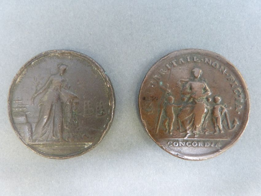 A medal coin commemorating the preliminaries of peace between Great Britain and France signed October 1st 1801, together with one other medal coin dated 1737