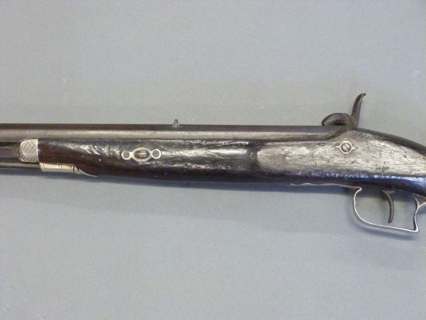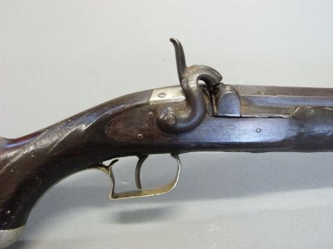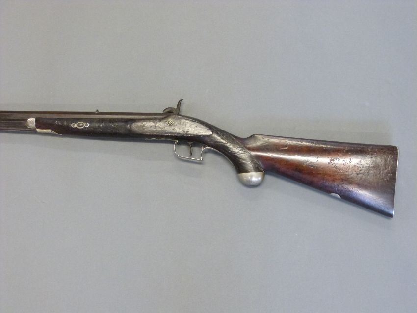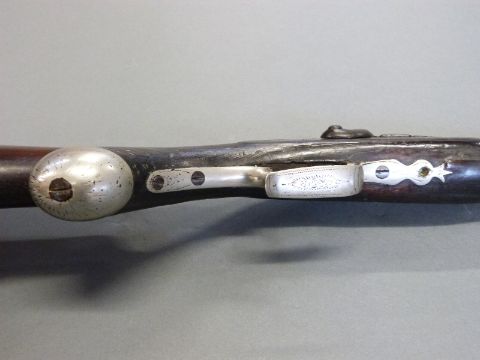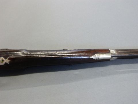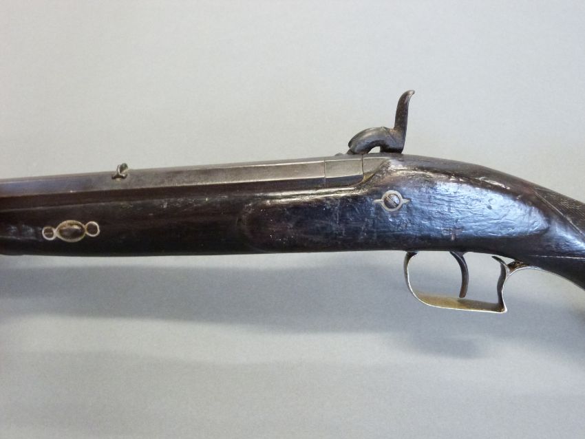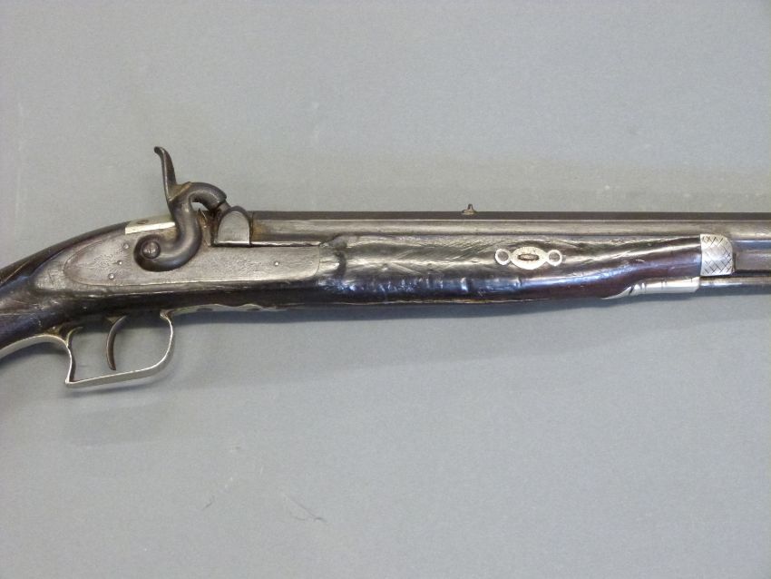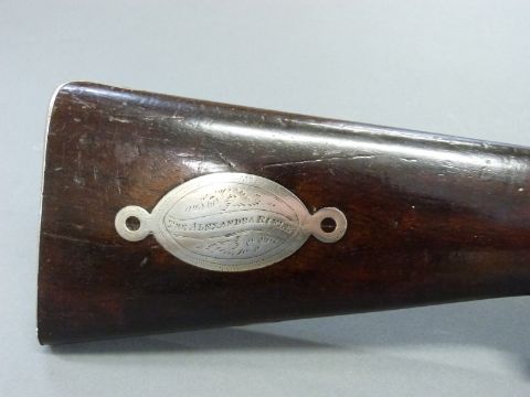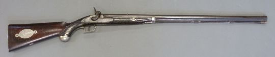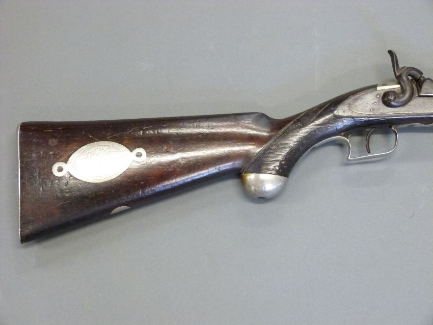 The Alexandra Rifle 32 bore percussion hammer action gun with engraved lock, silver mounts, trigger guard and butt cap, chequered semi-pistol grip, named and engraved plaque to stock and 28 inch octagonal barrel, overall length 113cm.