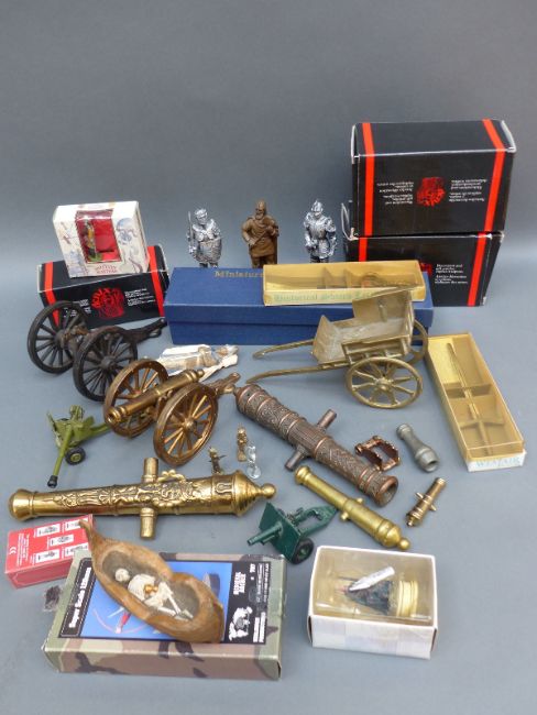 A quantity of collectable model cannon, swords, figures etc