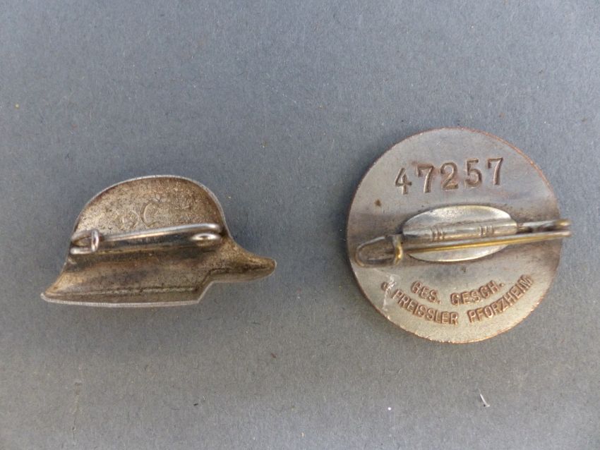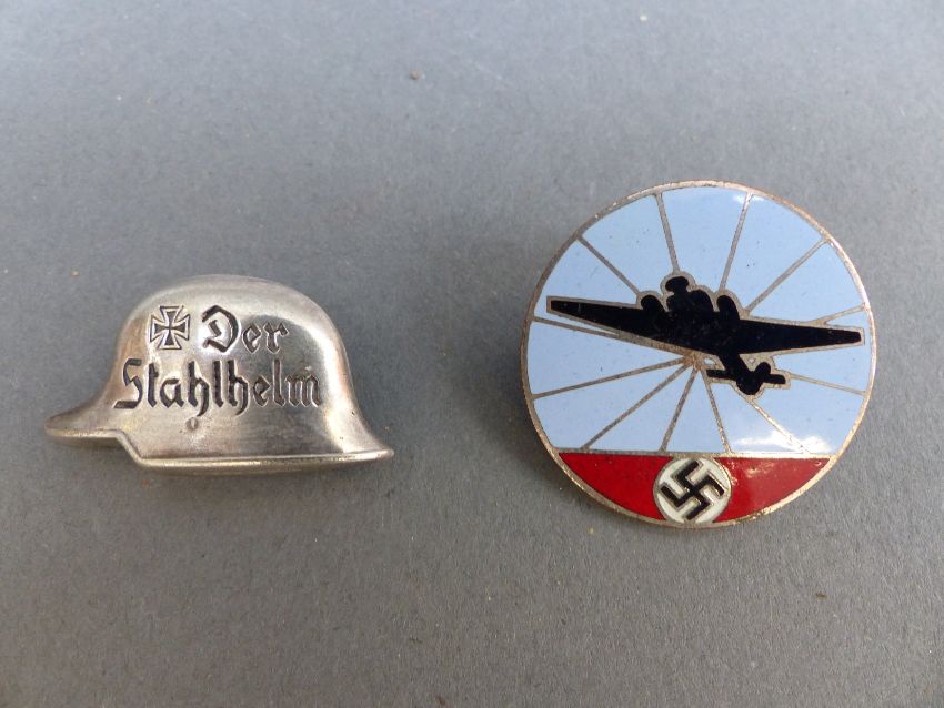 Two German Nazi pin badges, one a Luftwaffe Air Defence radio operator's enamel badge marked 47257, the other a Third Reich badge in the form of a helmet marked and Der Stahlhelm with a swastika
