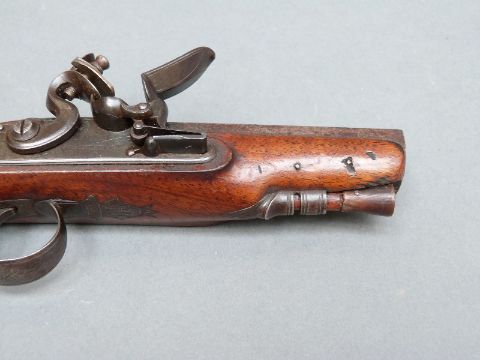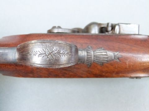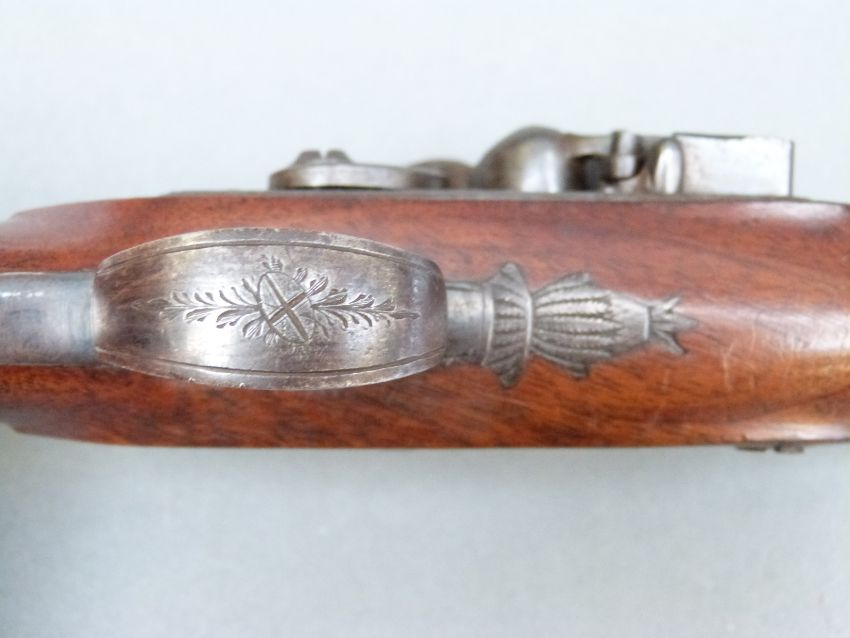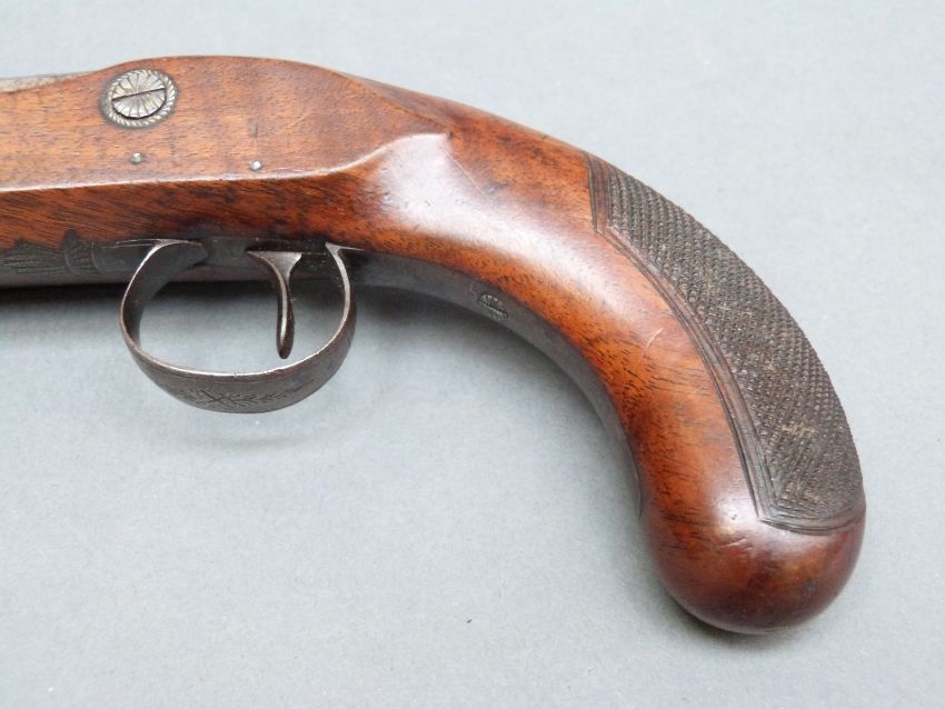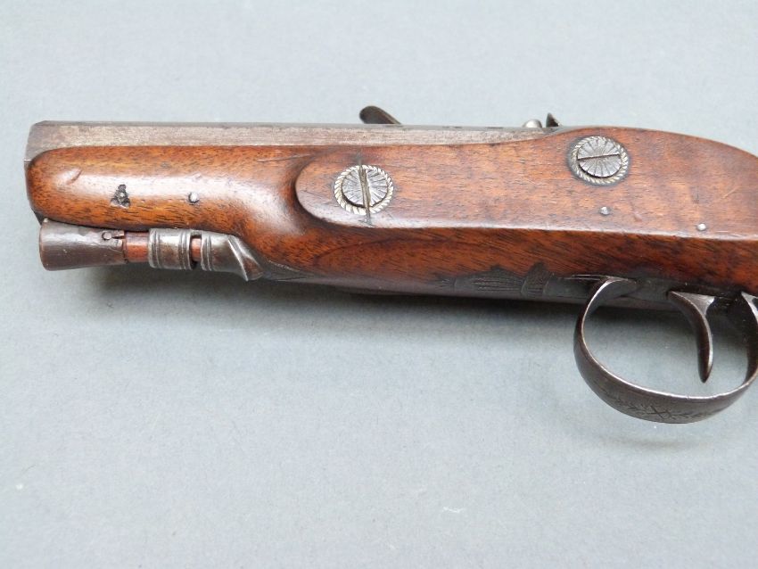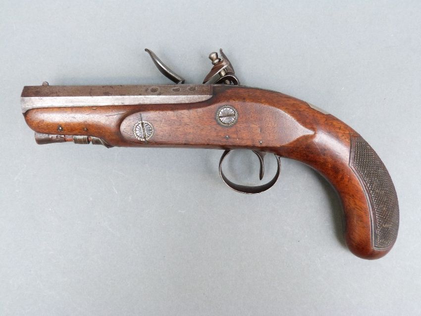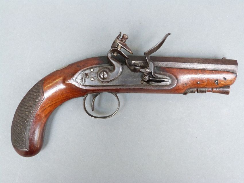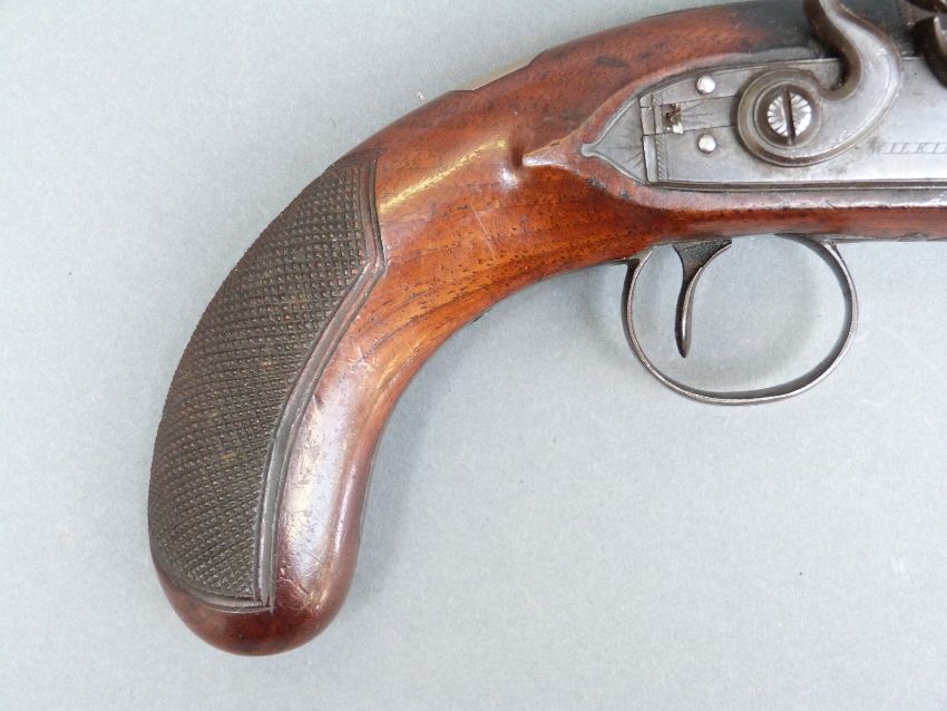 Wilkinson of Bristol 26 bore flintlock hammer action pistol with named and line engraved lock, chequered grip and vacant wrist cartouche to the walnut stock, engraved and pineapple finialled trigger guard, horn tipped ramrod, feather engraved top plate and 4.5 inch octagonal smooth bored barrel engraved 'Bristol' and stamped with proof marks, overall length 23cm.