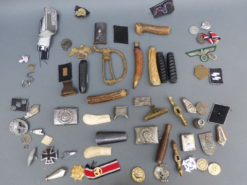 A quantity of military mainly reproduction handles, insignia, buckles etc., including Nazi German