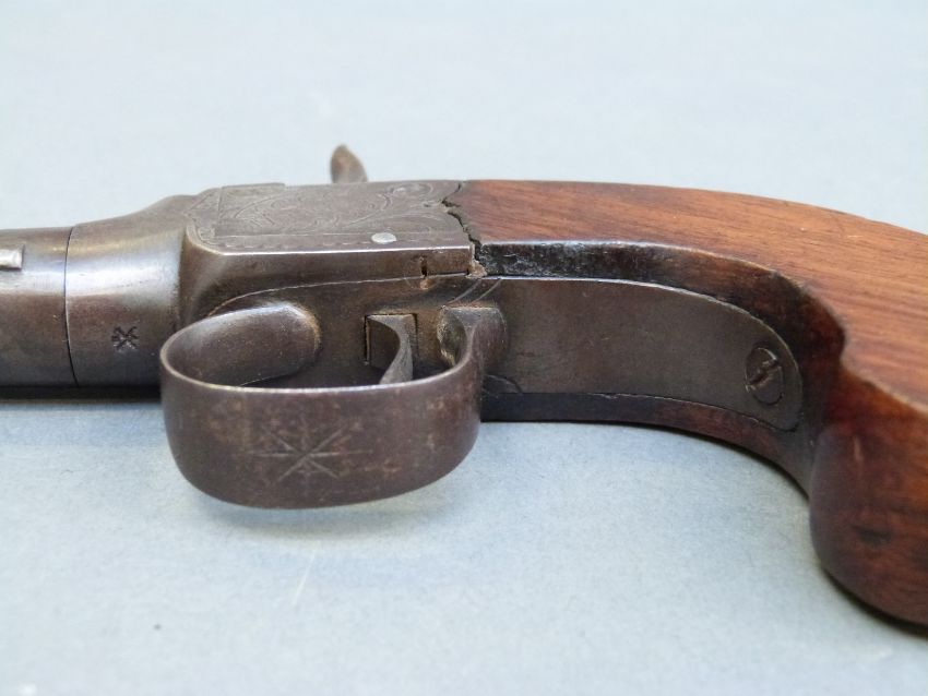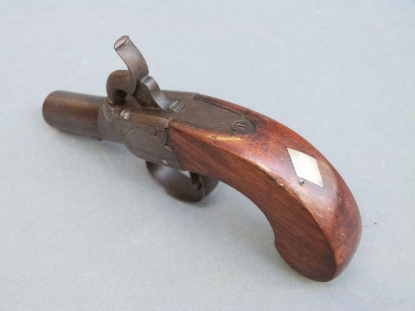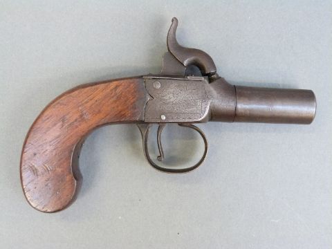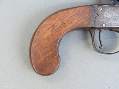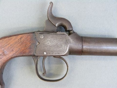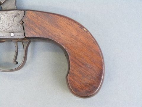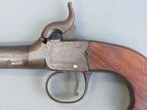 Percussion and hammer action pistol with indistinctly named engraved lock, shaped walnut grip, vacant wrist cartouche and 1.5 inch turn off smooth bored barrel, overall length 15cm.