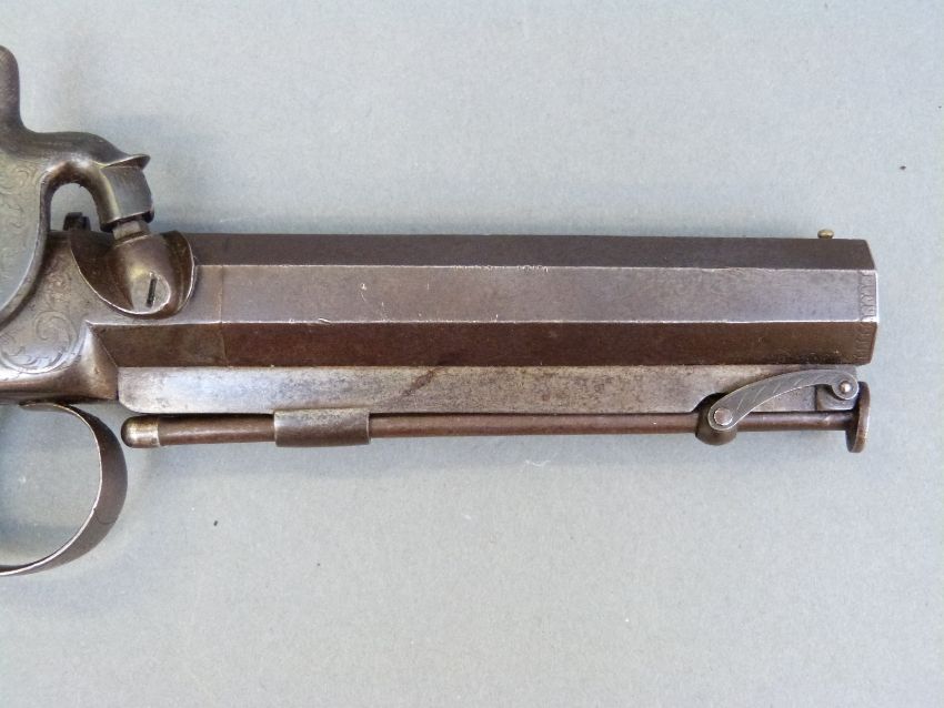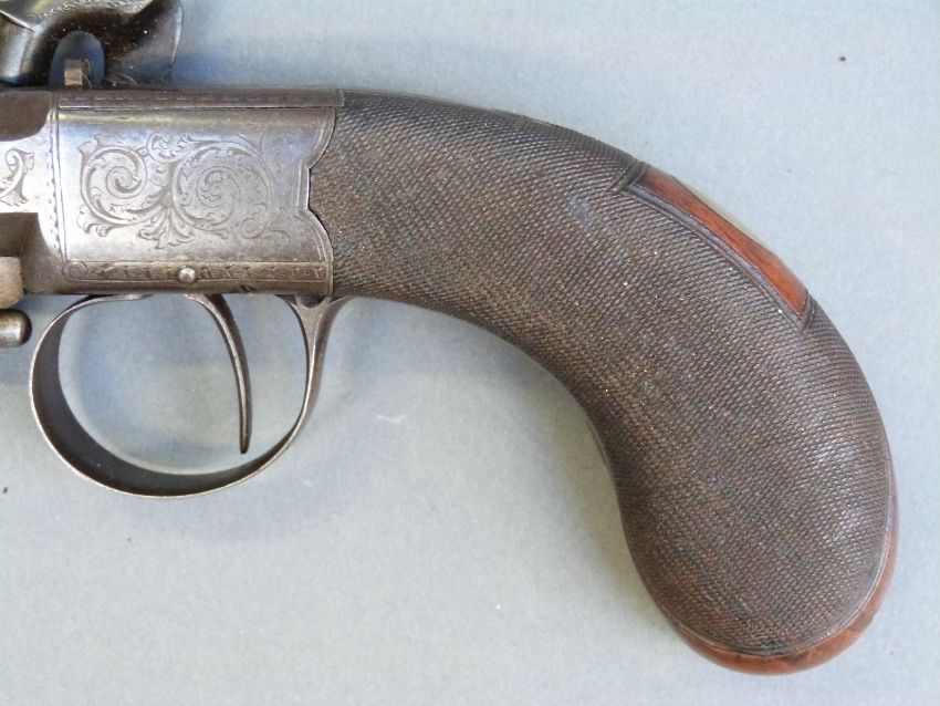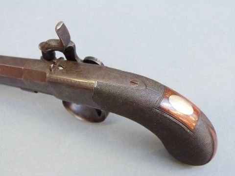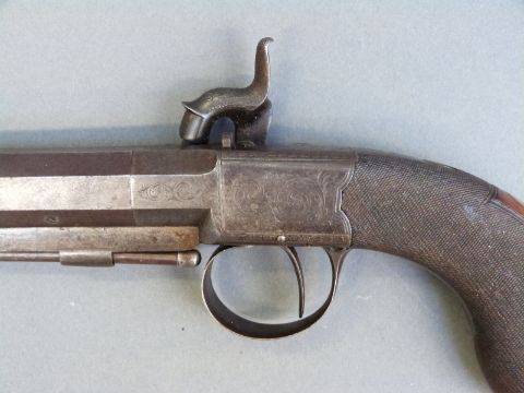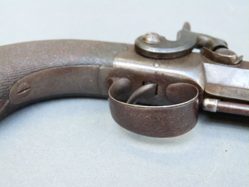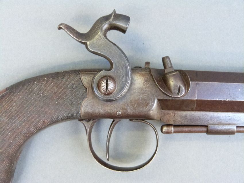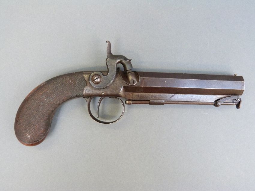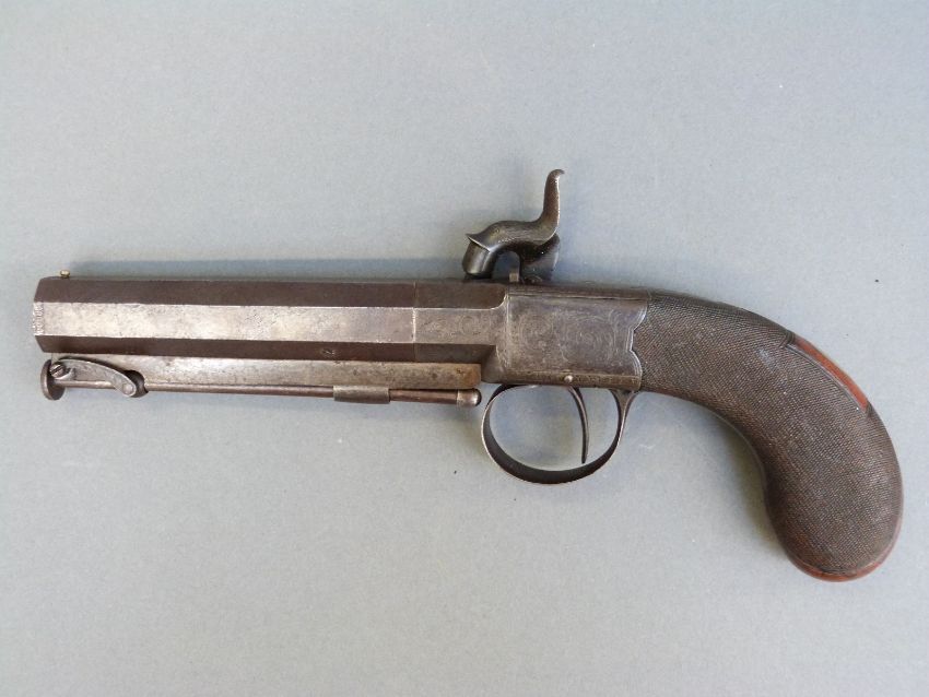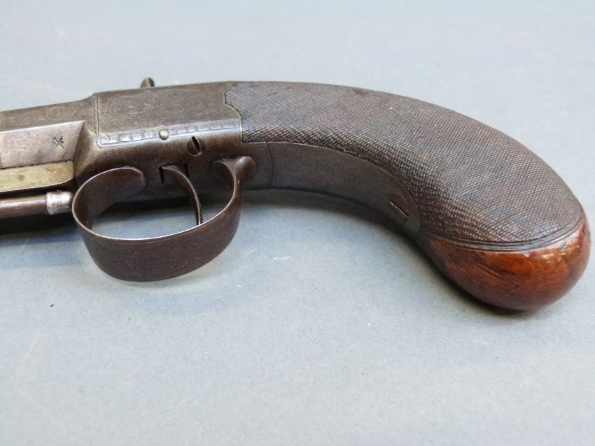 Percussion hammer action pistol with engraved lock, top plate, stylised dolphin hammer and trigger guard, chequered walnut grip, vacant wrist cartouche, engraved captive ramrod and 4.5 inch smooth bored octagonal barrel, overall length 23cm.