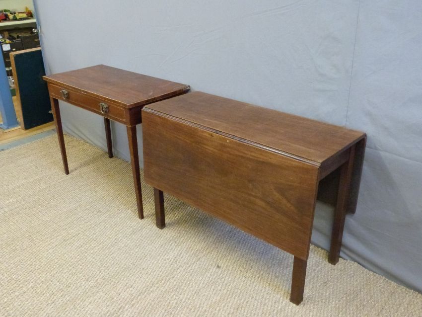 A 19thC drop leaf table, L101 x maximum W120 x H72cm and a hall table, width 92cm