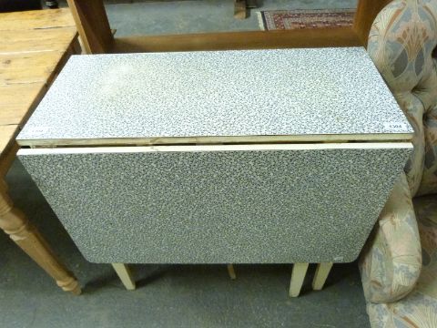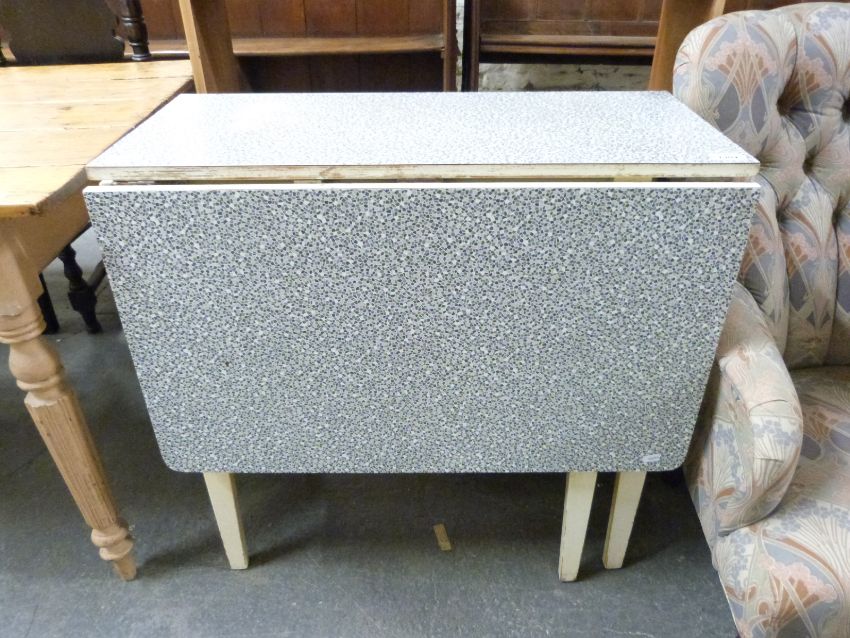 A retro 1950's Formica-topped fold-out table with cupboard and drawer, length 75cm