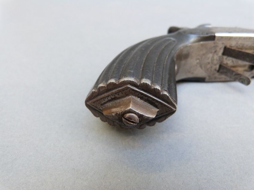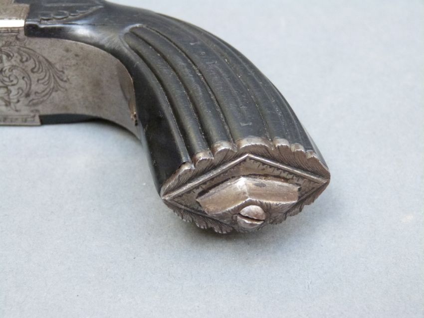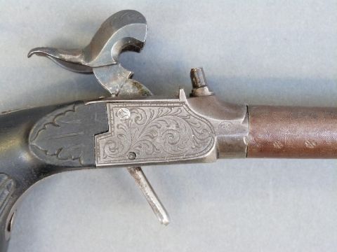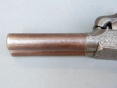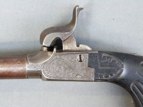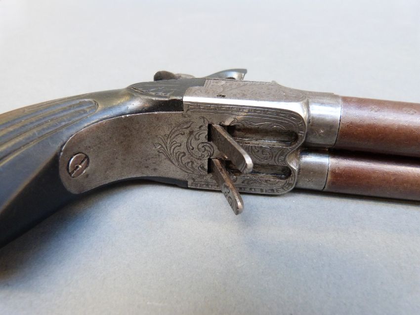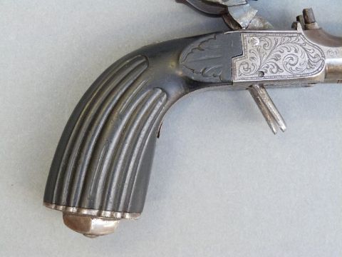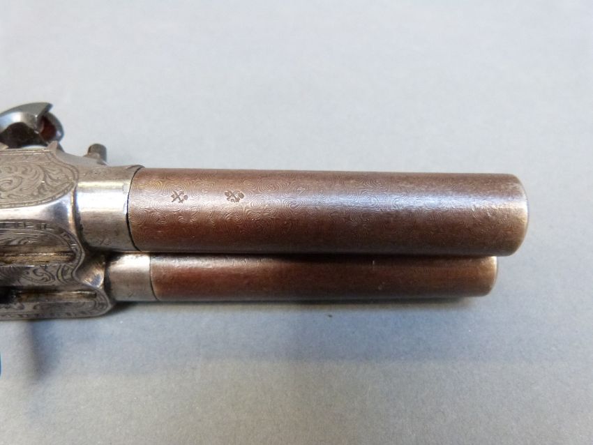 Belgian double barrelled side by side percussion hammer action pistol with engraved locks, top plate and butt cap, carved and reeded grip, stylised hammers, folding triggers and 2.5 inch smooth bored barrels, overall length 19cm.