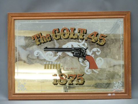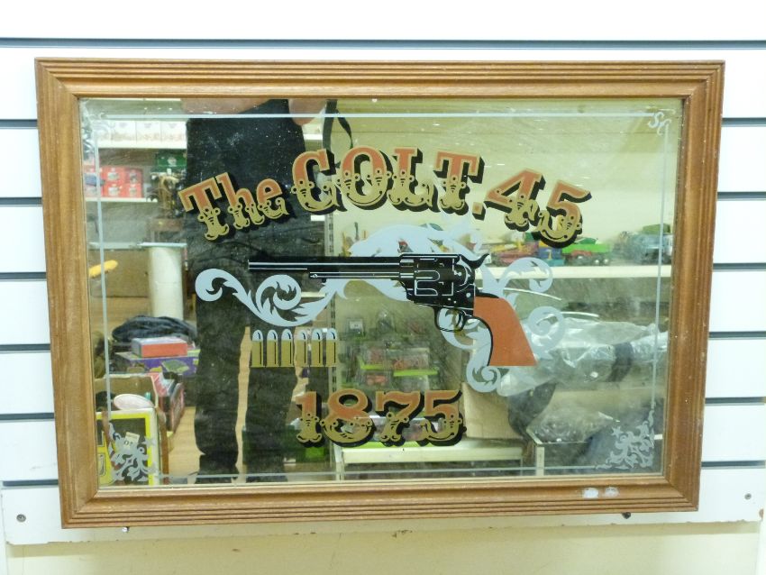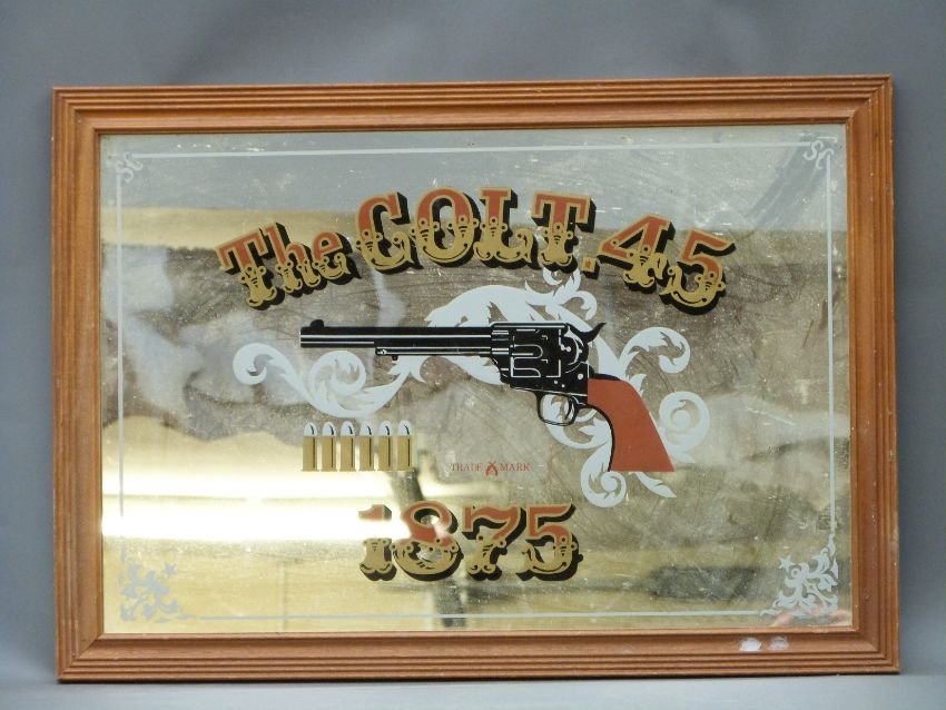 The Colt .45 1875 revolver advertising mirror in wooden frame, 61cm x 87cm