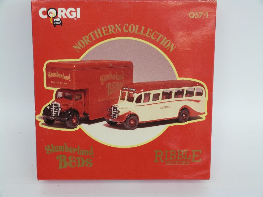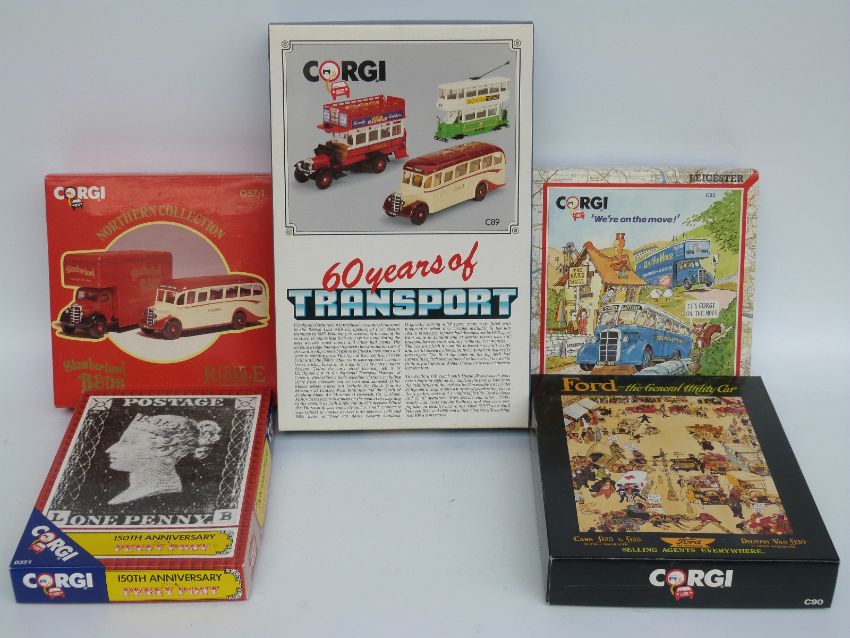 Five Corgi diecast model vehicle sets comprising 60 Years of Transport C89 Ford - The General Utility Car C90, Northern Collection Ribble Motors Slumberland Beds Q57/1, We're On The Move! C82 and 150th Anniversary of the Penny Post D37/1, some limited edition, all in original boxes