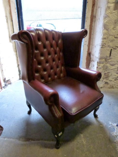 A red Chesterfield wing-back chair