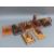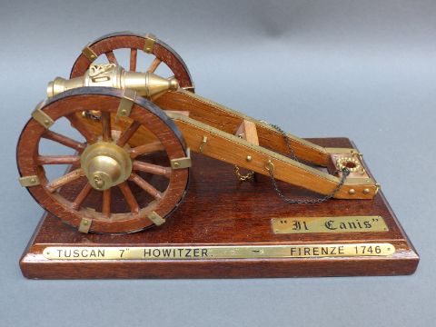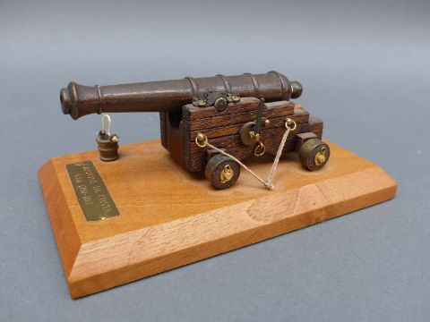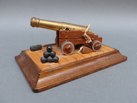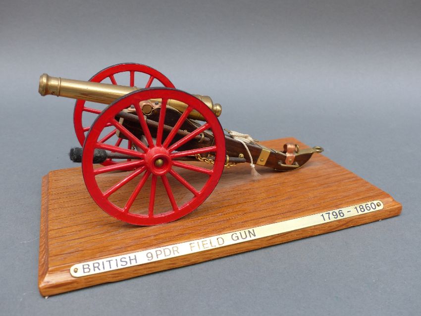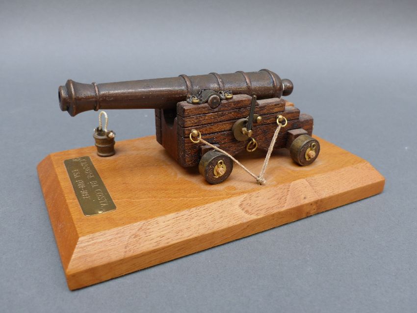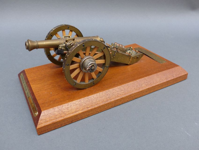 Seven brass and wooden model cannon, each approximately 20cm long on base
