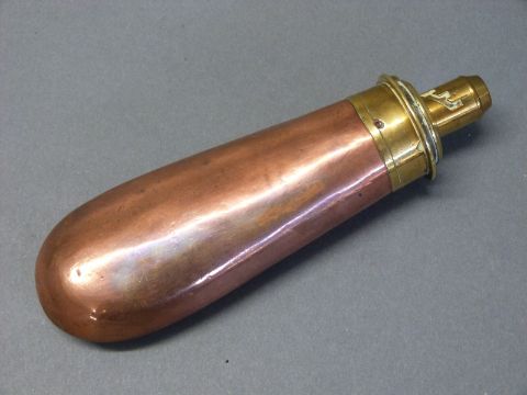 G & JW Hawksley copper and brass powder flask, 16.5cm long