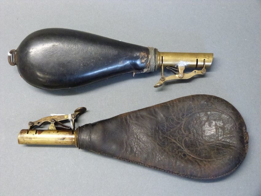 Two leather and brass shot flasks one by James Dixon & Sons with embossed decoration of a rural scene to both sides the other with hard body and single suspension loop, 21cm long.