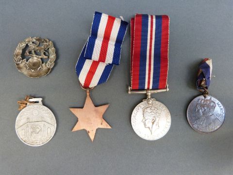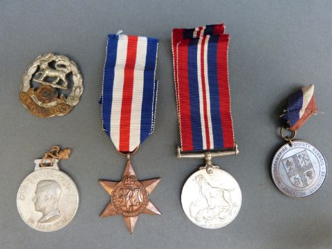 Two WWII medals comprising 1939-45 medal and a France and Germany star in box marked Ron Smart, with Hampshire cap badge, 1935 Nottinghamshire County Council Education Committee medal and 1926 Empire Prince aluminium medal