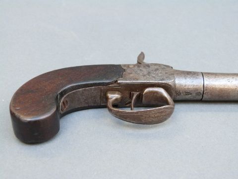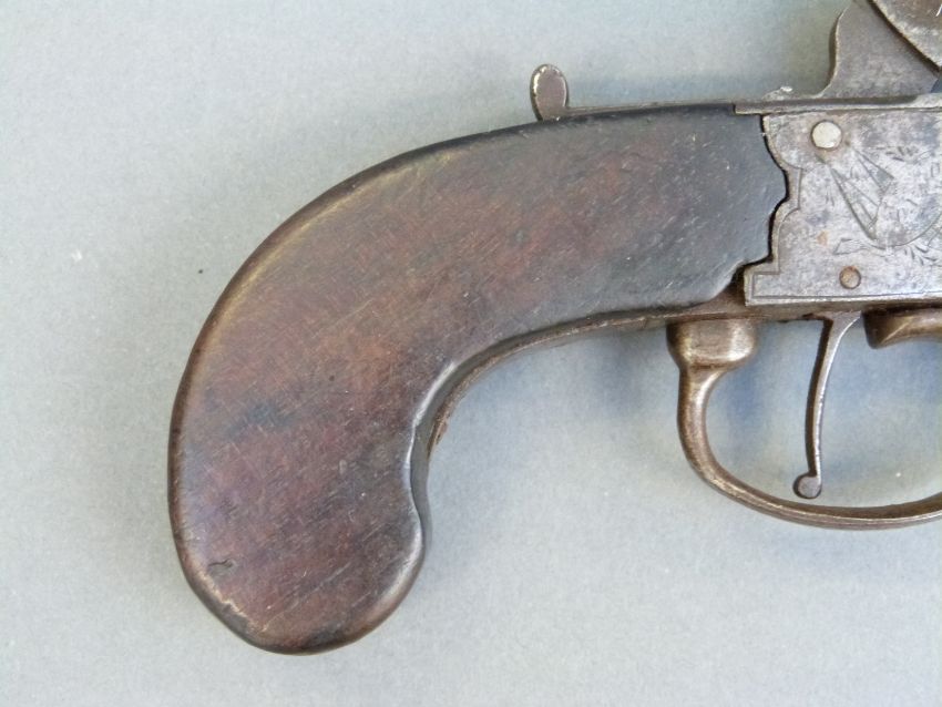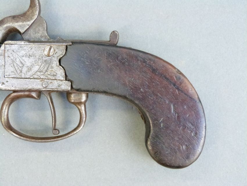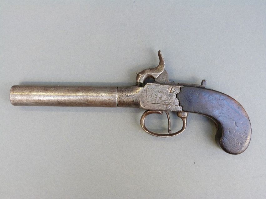 Percussion hammer action pistol with indistinctly named and engraved locks, thumb slide safety, stylised hammer and 3.5 inch turn off smooth bored barrel, overall length 21cm.