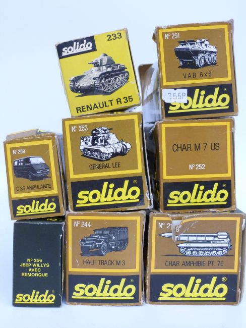 Eight Solido diecast model military vehicles, Char Amphibie PT.76 'Lance Fusee' 218, Renault R35 233, Half Track M3 244, VAB 6x6 (SAVIEM-Creusot Loire) 251, Char M7 US 252, General LEE 253, Jeep Willys avec Remorqre 256 and C35 Ambulance 259, all in original boxes