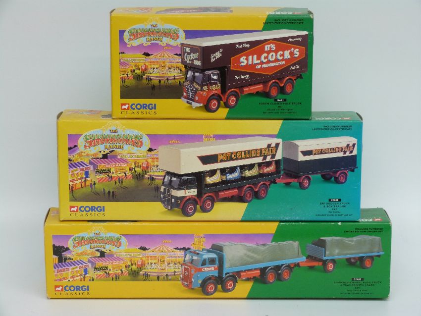 Three Corgi Classics The Showman's Range diecast model sets Billy Crow & Sons Atkinson 8 wheel Rigid Truck and Trailer with Loads set 27602, Pat Collins ERF Dodgem Truck and Box set 09901 and Silcock's of Warrington Foden Closed Pole Truck set 12601, all in original boxes