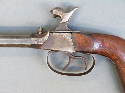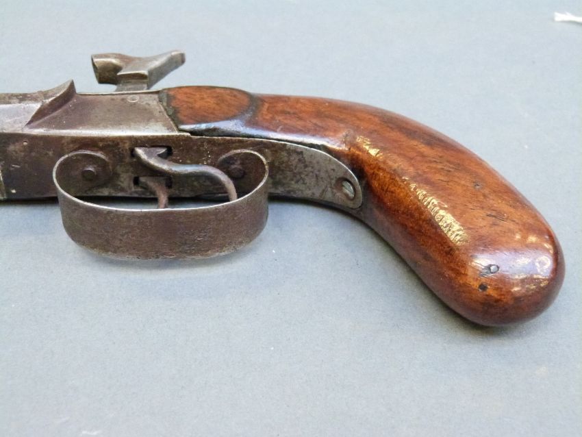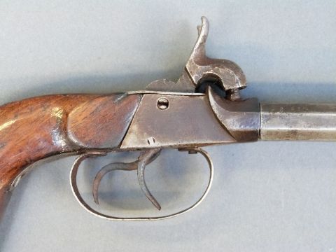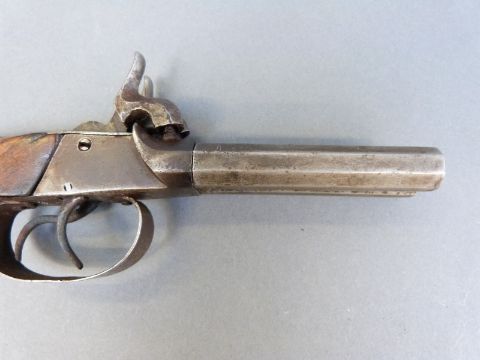 Double barrelled side by side percussion hammer action pistol with shaped mahogany grip, double trigger and 3 inch smooth bored octagonal barrel, overall length 22cm.