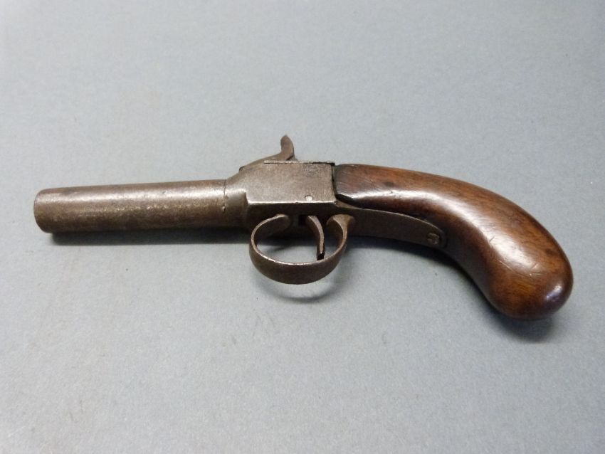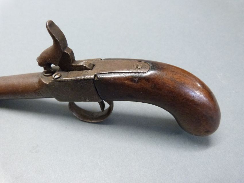 Percussion hammer action pistol with engraved hammer and 2.75 inch smooth bored turn off barrel, overall length 18cm.