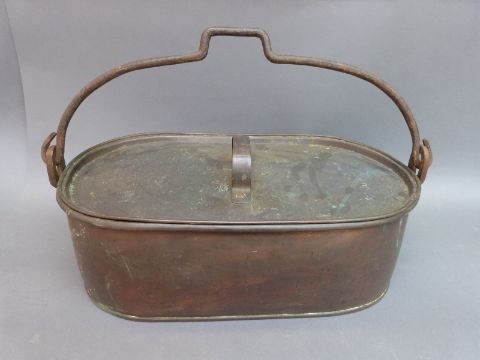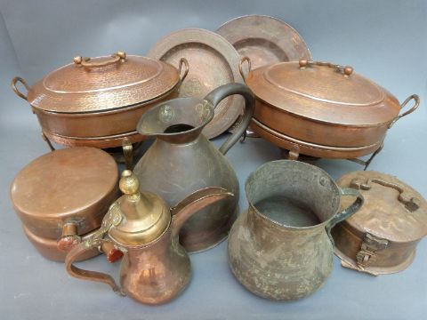 A 19thC dallah, Victorian jug, copper fish kettle and food warmers etc