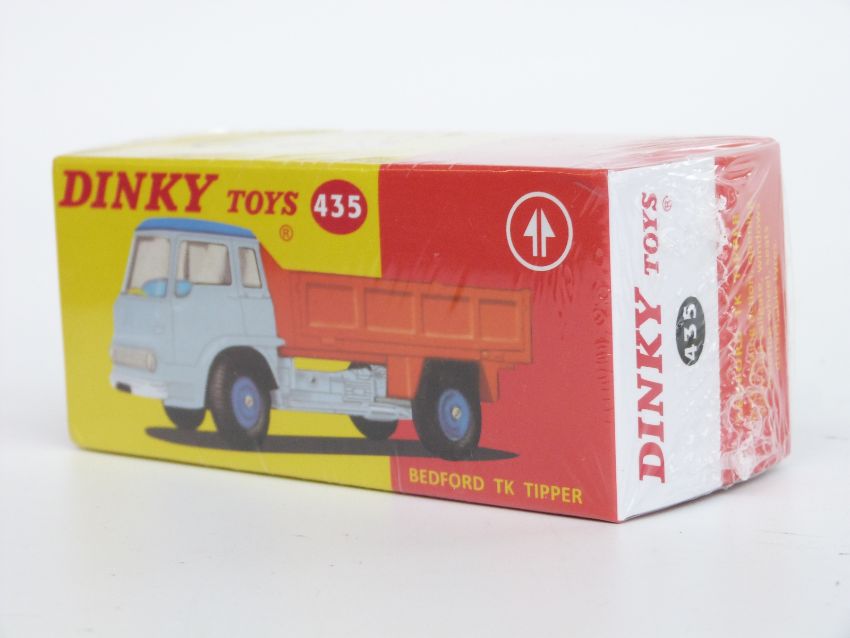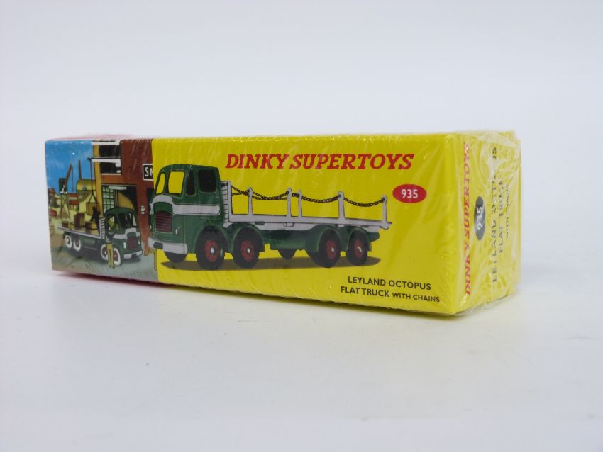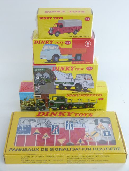 Five Atlas Editions, Dinky Toys and Dinky Supertoys diecast model vehicles and accessory sets Austin Covered Wagon 413, Bedford TK Crash Truck 434, Bedford TK Tipper 435, French Road Signs 593 and Leyland Octopus Flat Truck with Chains 935, all sealed in original boxes