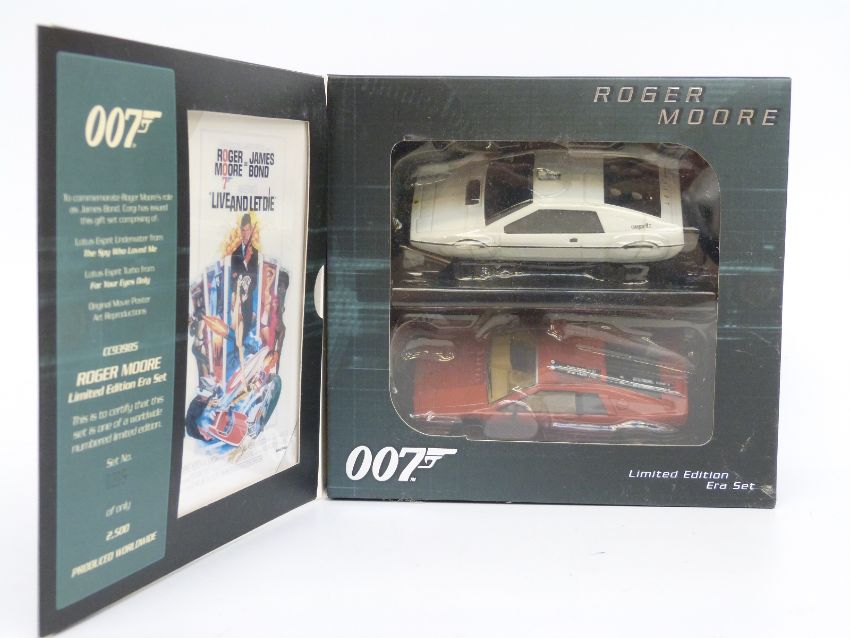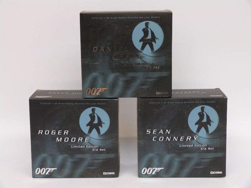 Three Corgi James Bond 007 1:36 scale limited edition diecast model Era sets, Sean Connery, Roger Moore and Daniel Craig, all in original display boxes