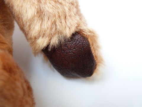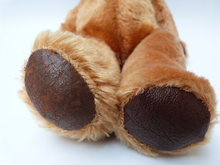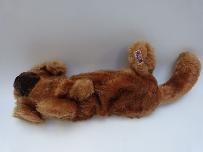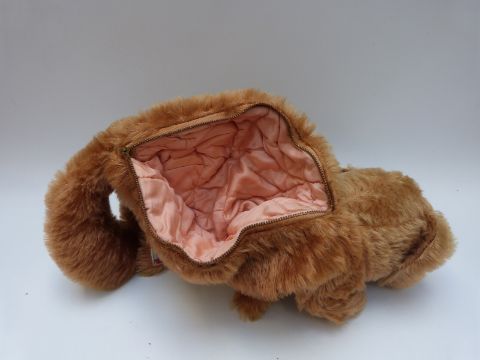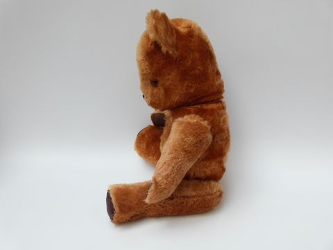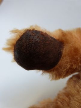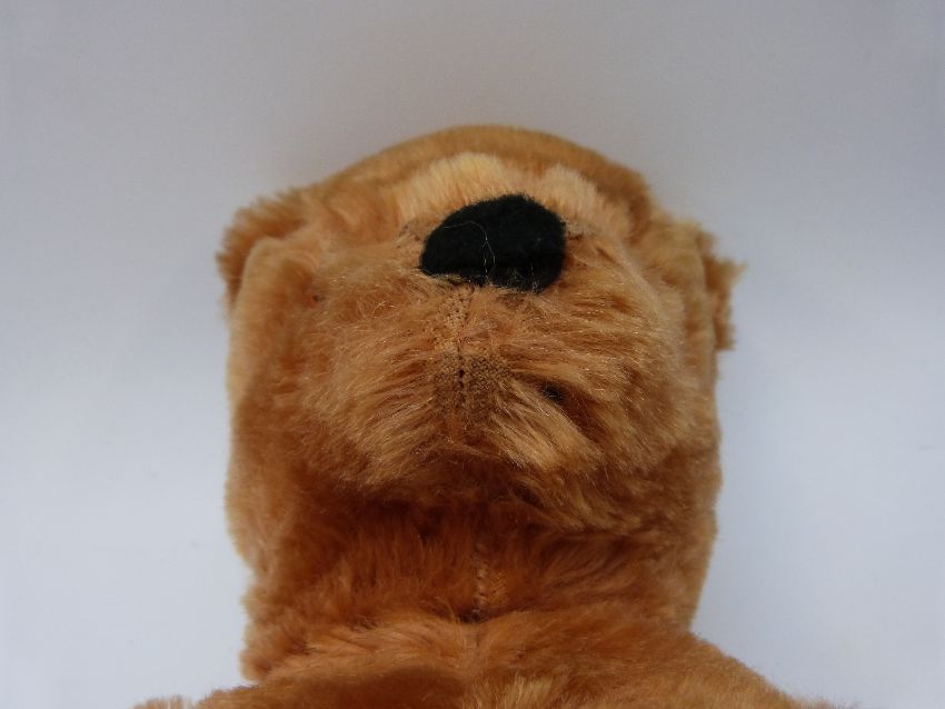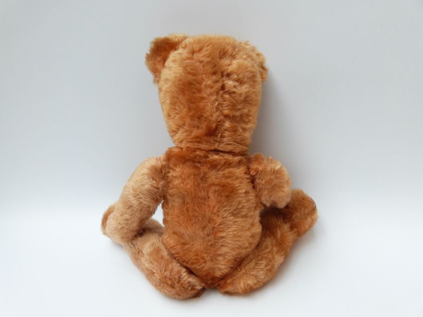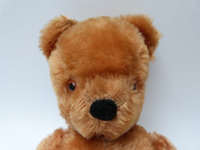 A Chiltern style cinnamon mohair Teddy bear with orange and black eyes, leather pads and jointed limbs, 35cm tall together with a Farnell Alpha toys cinnamon mohair pyjama case.