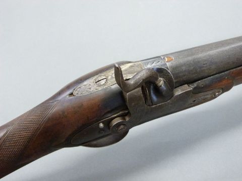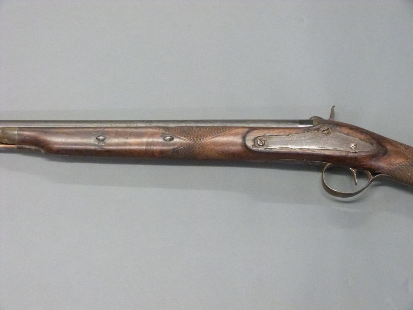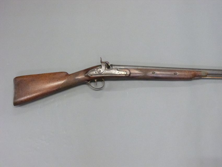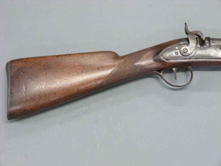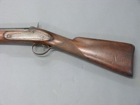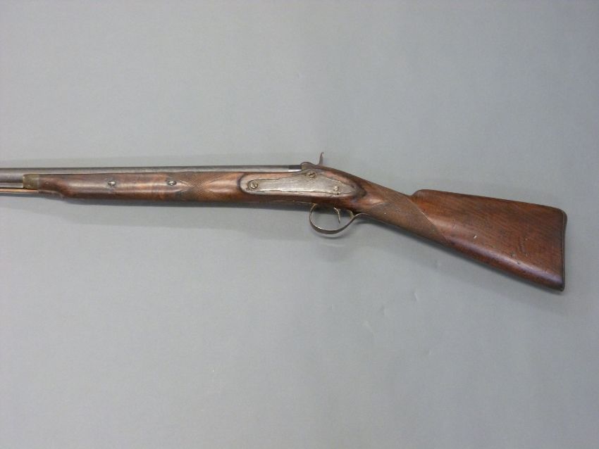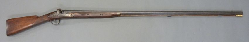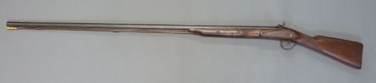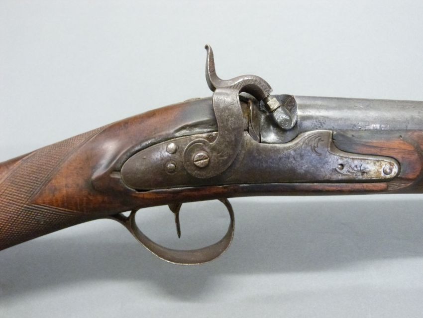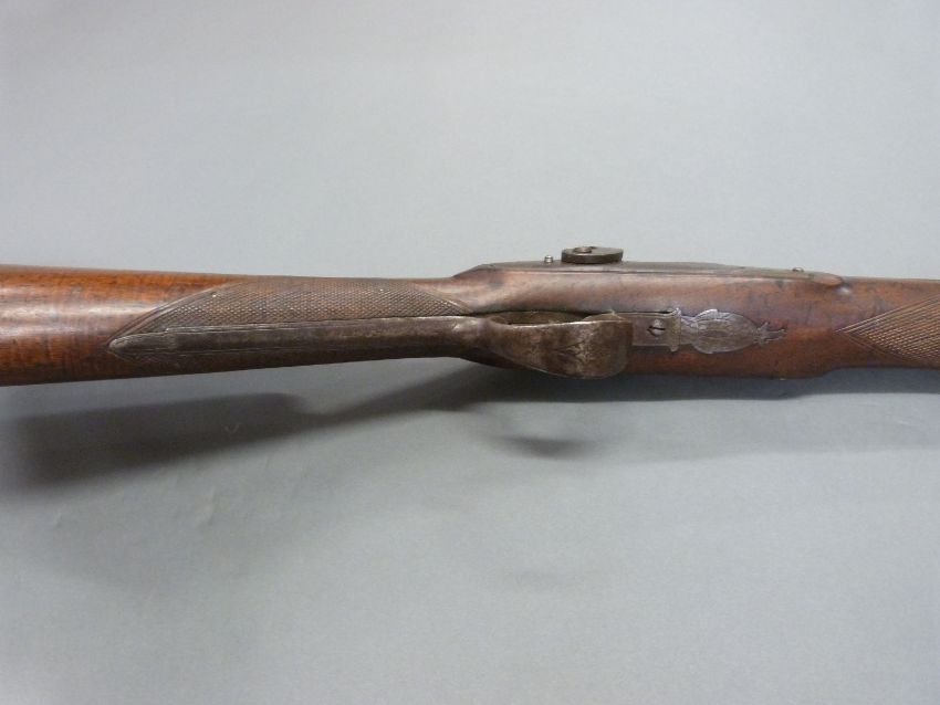 Unnamed 10 bore percussion hammer action gun with engraved lock, hammer, top plate and pineapple finialled trigger guard, horn tipped forend, and 53 inch barrel, overall length 176cm.