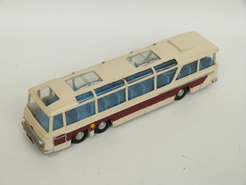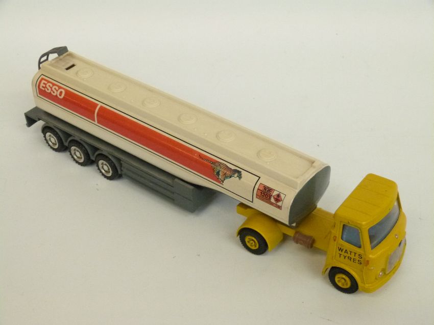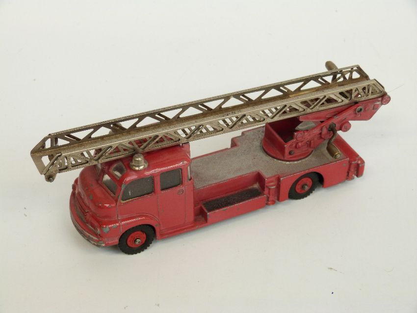 Ten Dinky Toys and Dinky Supertoys diecast model vehicles including fire engines, lorry-mounted cranes, tankers, buses etc together with two Dinky Toys magazines and various unused transfers