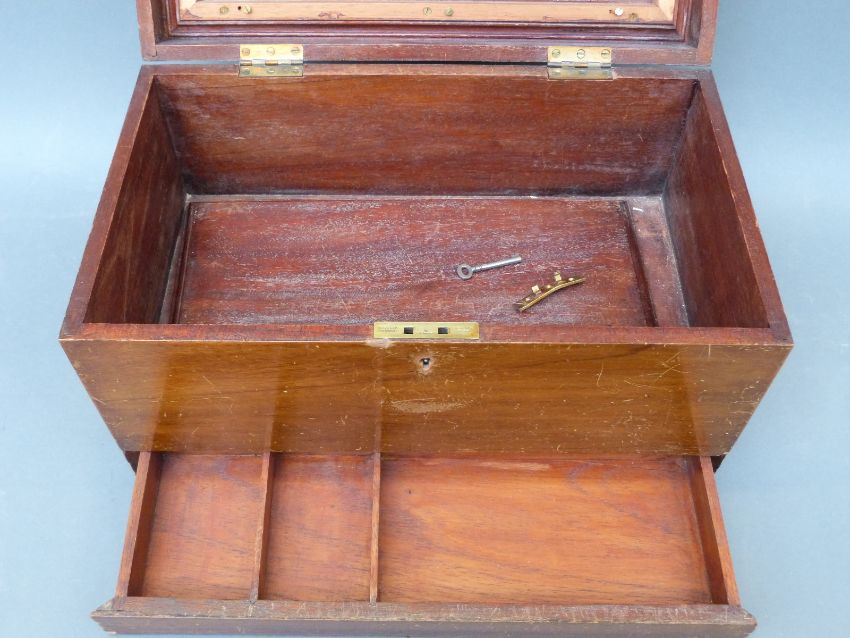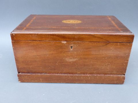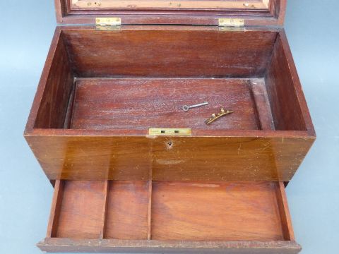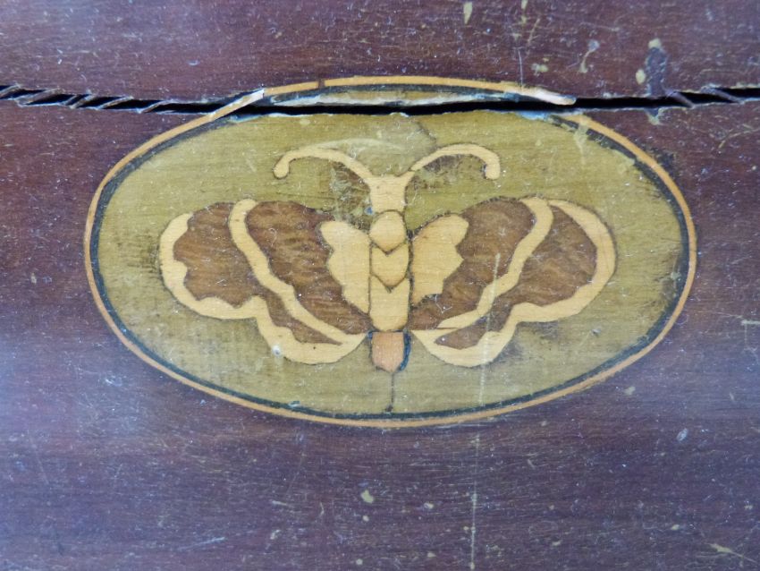 A large inlaid box with moth decoration to the lid, inlaid banding and drawer to the underside