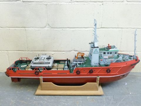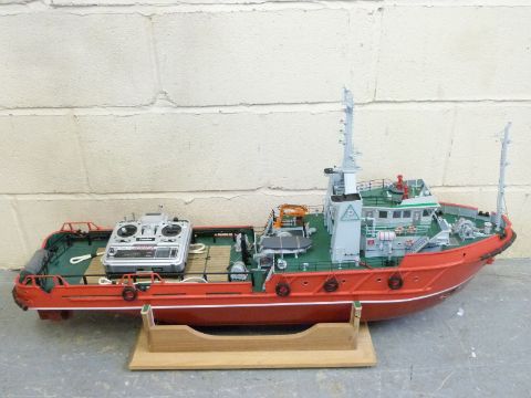A large remote controlled model boat on stand, in fitted wooden box, length 112cm