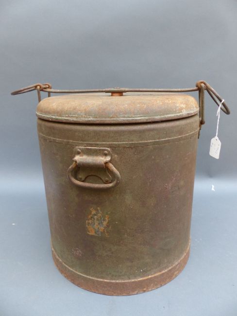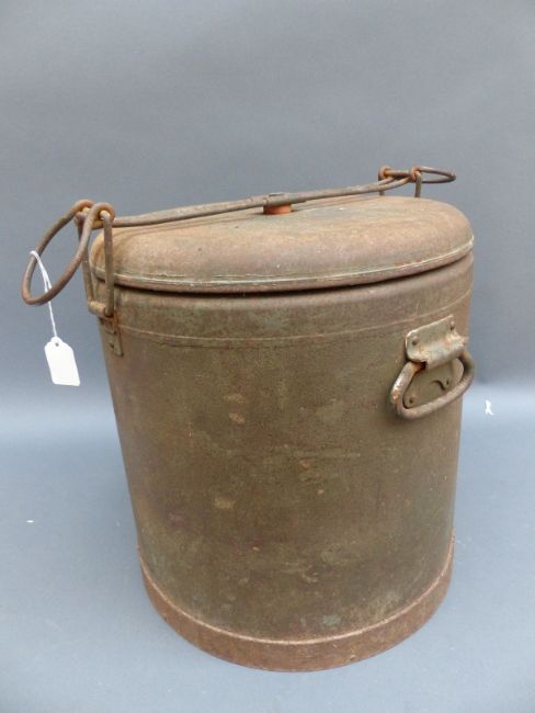 United States Army WWII metal Mermite food or blood plasma container with enamelled interior, two insert containers and 'US GP and F Co 1943' to the underside of the lid. Originally from US troops based near Frome, Somerset