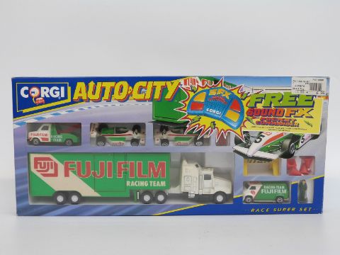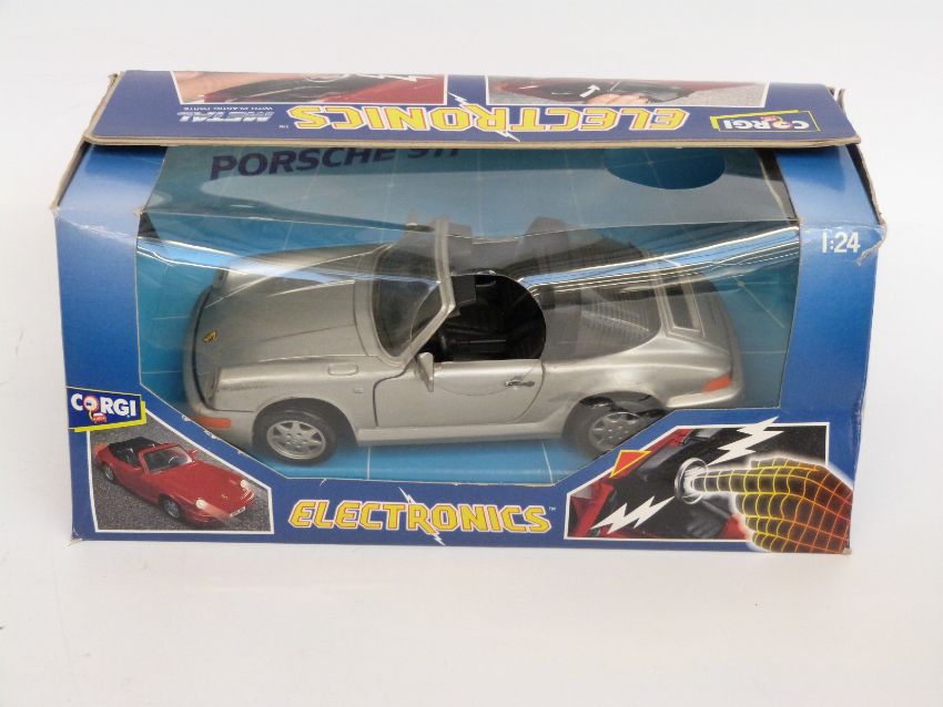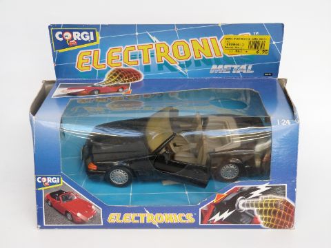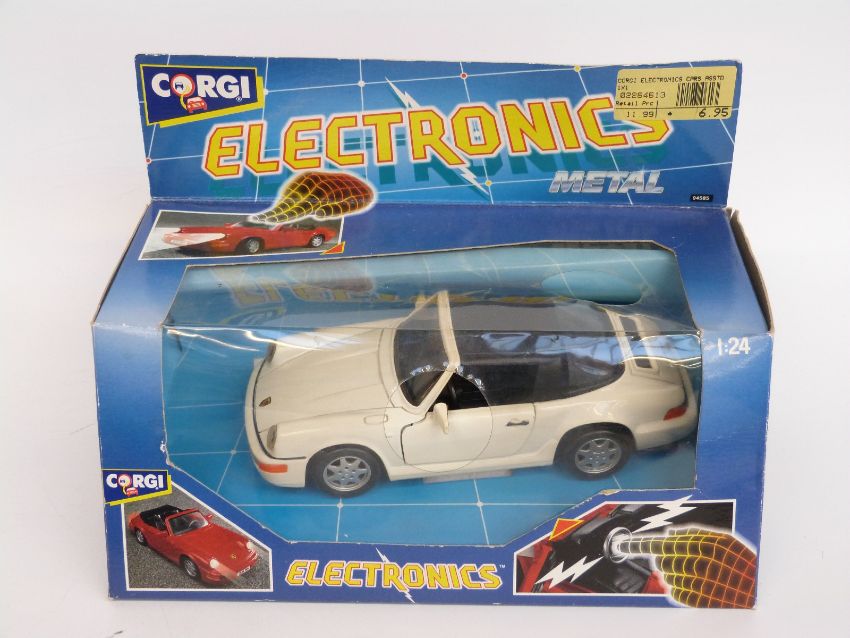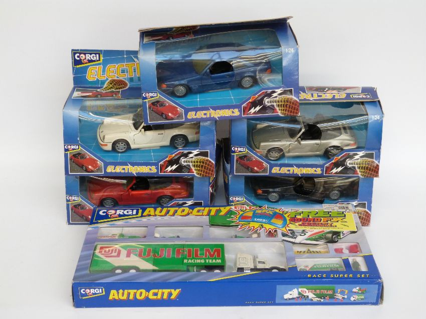 Five Corgi Electronics diecast model cars and a Corgi Auto-City Race Super Set, all in original boxes