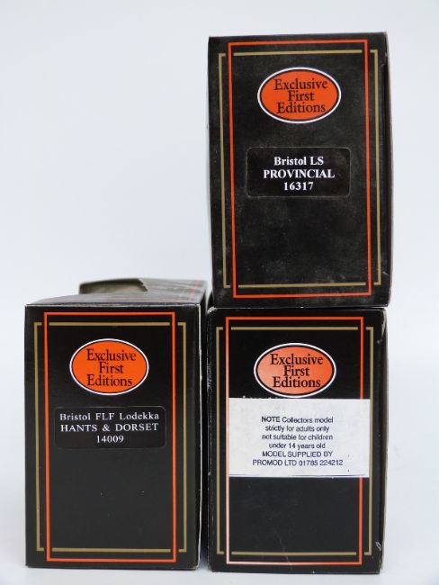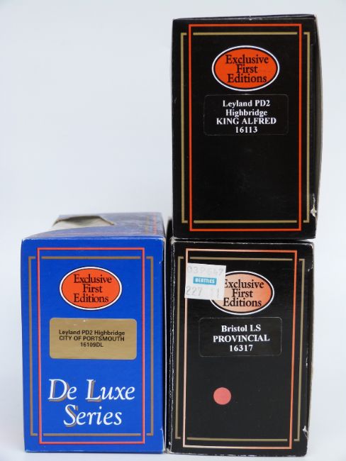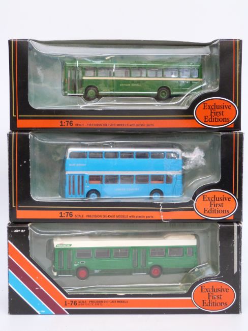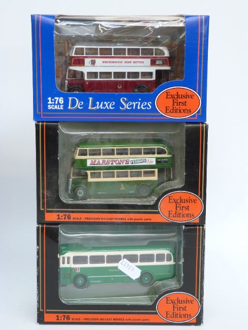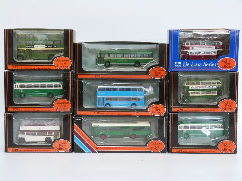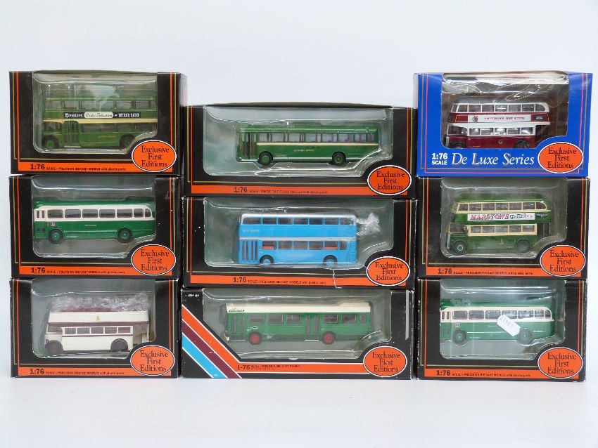 Nine Exclusive First Editions (EFE) diecast model buses including Deluxe Series, all in original boxes