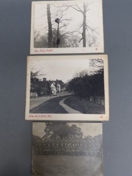 A collection of postcards to include traction engines, places and WWI postcards, together with military pictures and paperwork relating to G.Harrison, framed picture, Rifle Brigade cap badge etc
