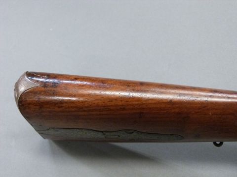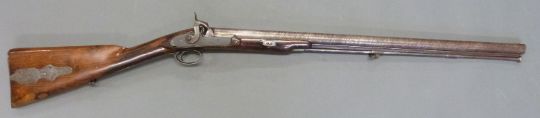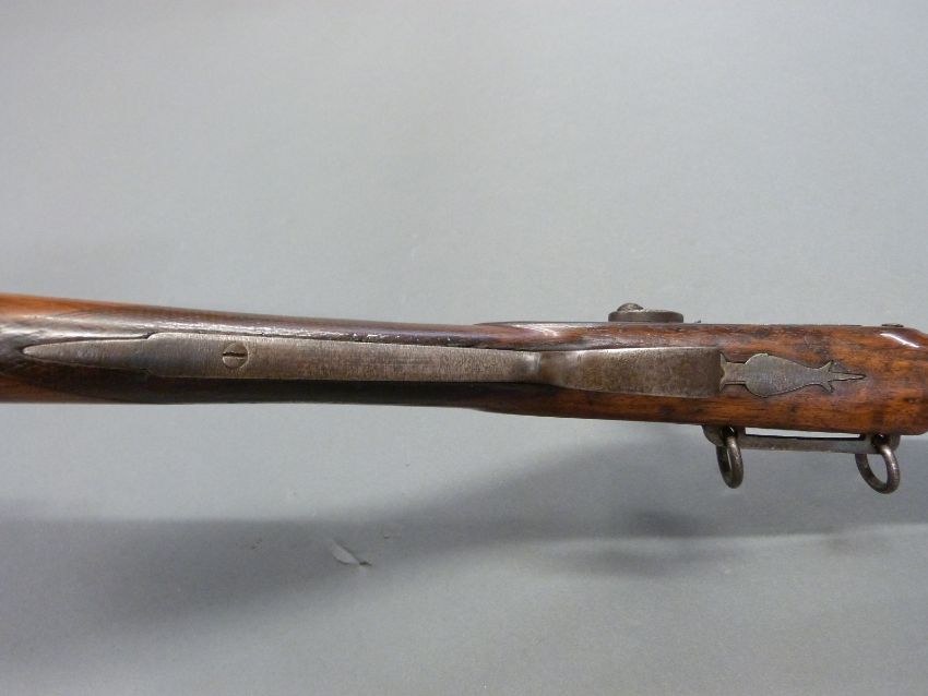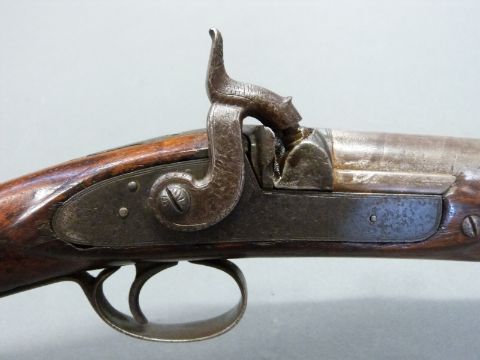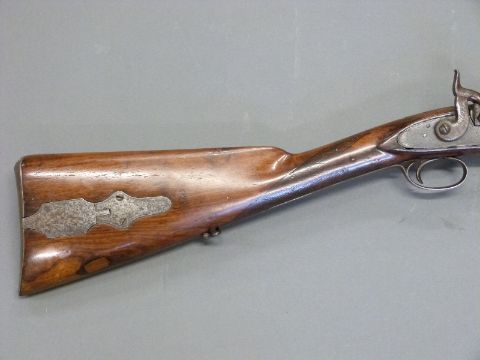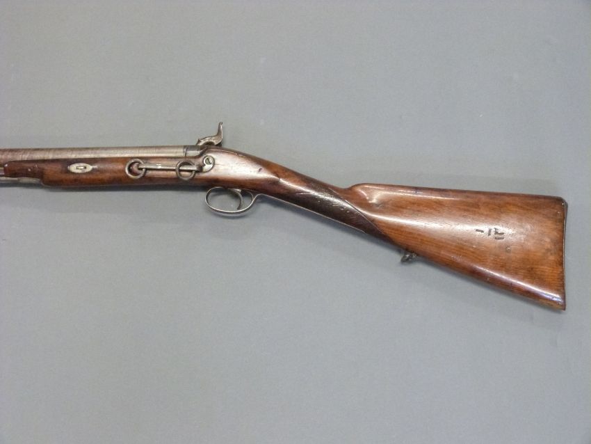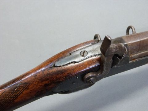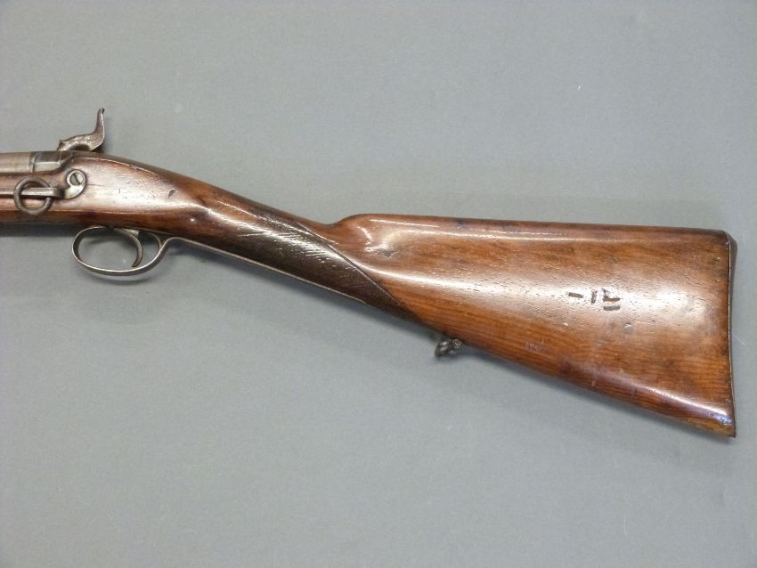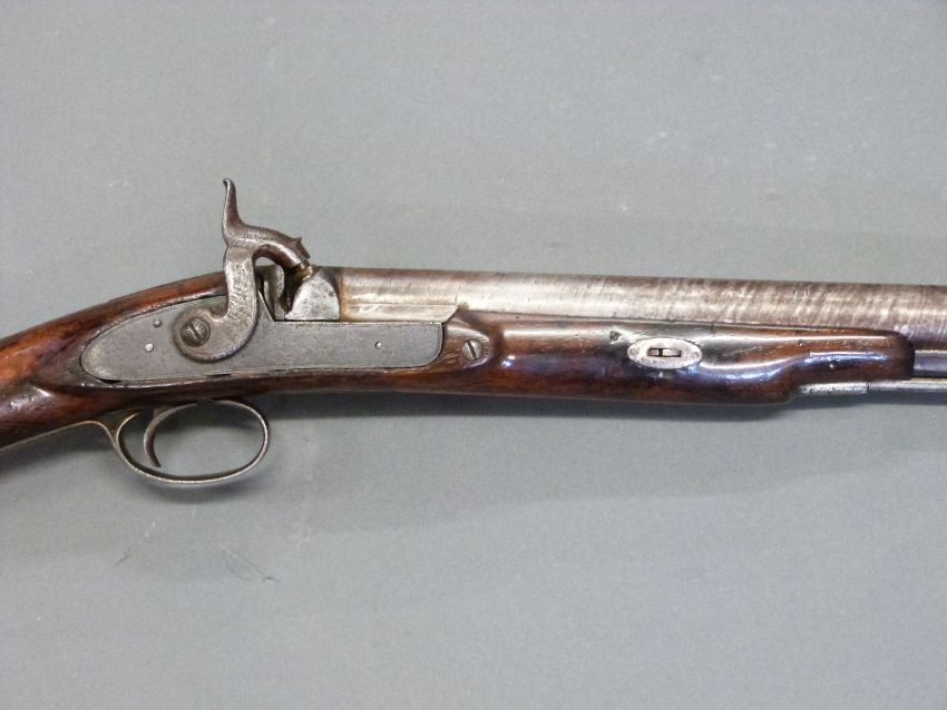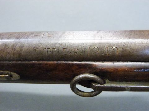 24 bore percussion hammer action gun with engraved hammer, chequered grip, steel butt plate, trigger guard, ram-rod and mounts, sling suspension loops, storage compartment to butt. Butt stamped SKJ and 1/11 and 25 inch Damascus barrel stamped JPR / EXRA 1840 and 1/11, overall length 104cm serial number 917