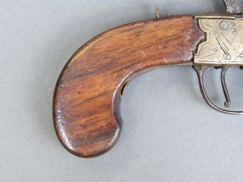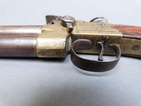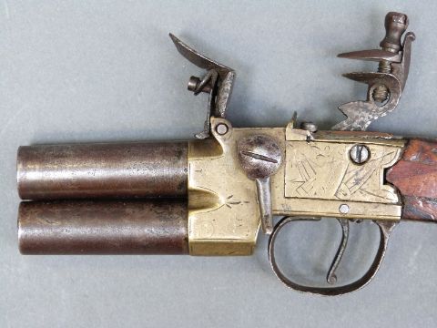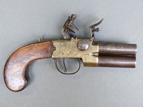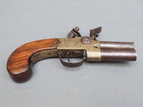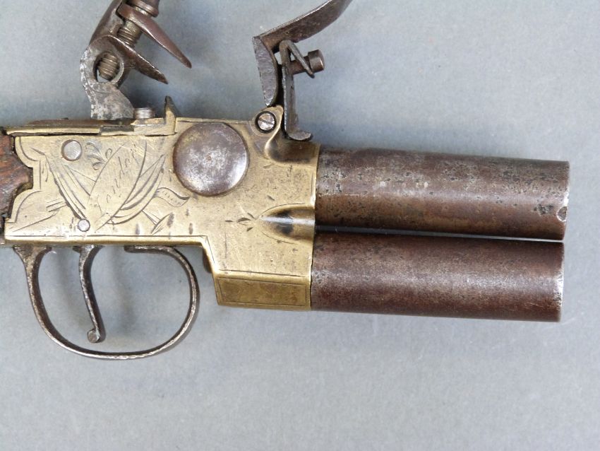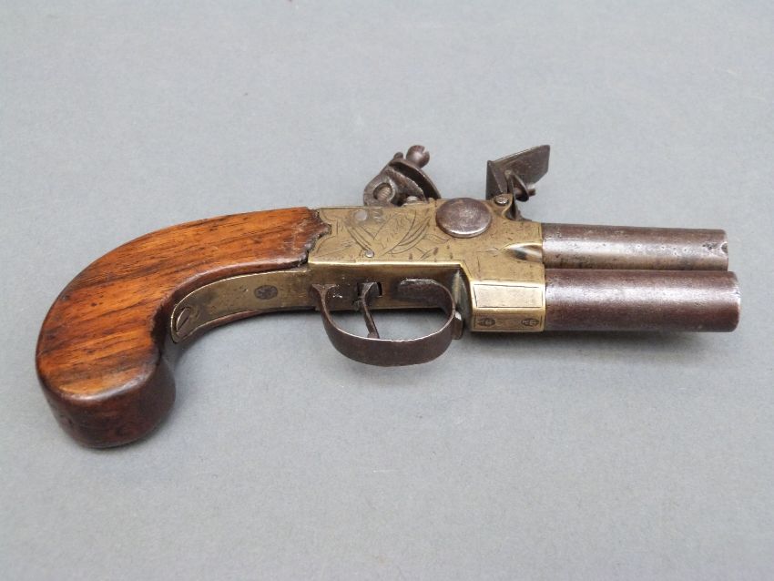 Indistinctly named 72 bore double barrelled over and under flintlock hammer tap action pistol with brass lock engraved with maker's name and 'London', thumb slide safety, shaped mahogany grip and 1.75 inch turn smooth bored barrels, overall length 16.5cm.