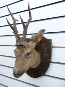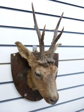 A taxidermy study of an antelope on wooden shield mount