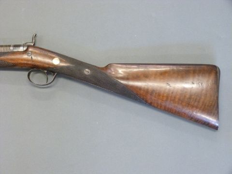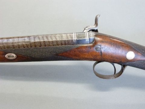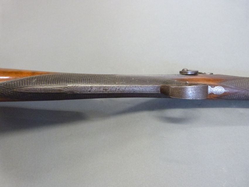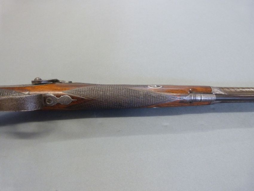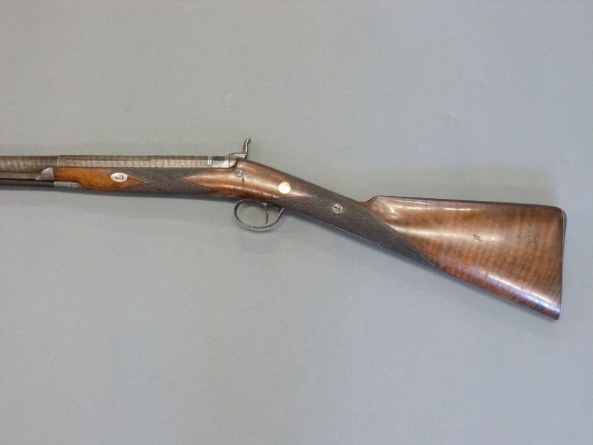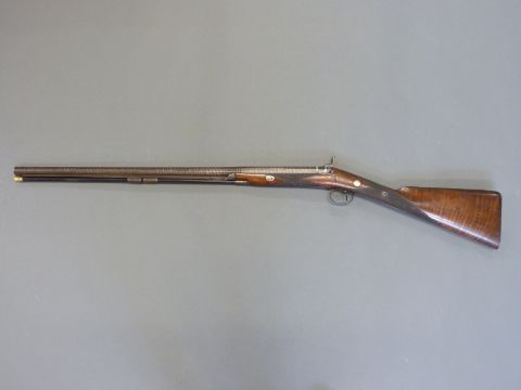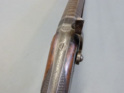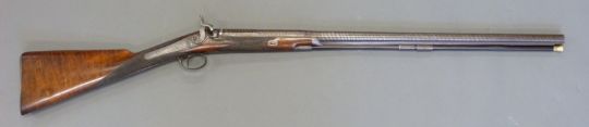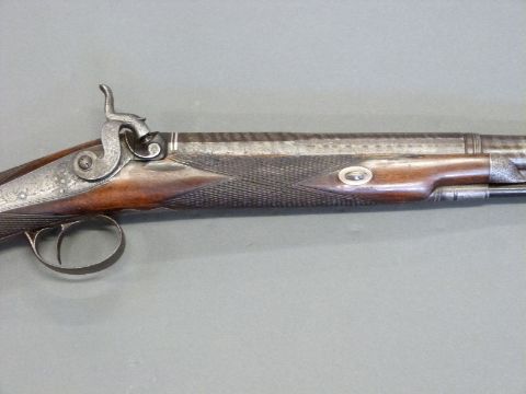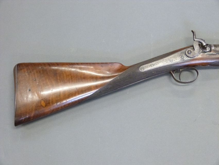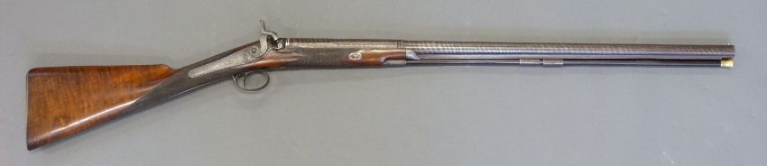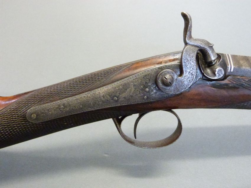 Williams & Howell percussion hammer action gun with lock named and engraved with countryside scenes, engarved stylised dolphin hammer, trigger guard, top plate and butt plate, chequered grip and forend, and 30 inch silver inlaid and engraved multi-stage Damascus barrel, overall length 116cm.