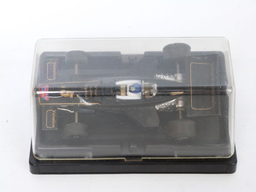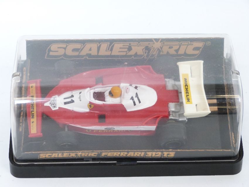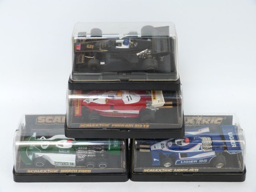 Four Scalextric model Formula 1 cars March Ford C131, Ferrari 312T3 C136, Ligier JSII C137 and Lotus 77 C126, all in original boxes