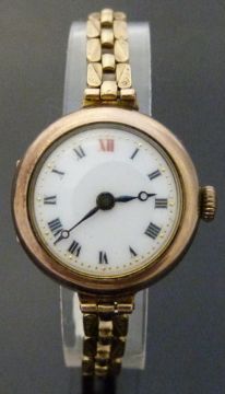 9ct gold ladies wristwatch with Roman numerals, blued Breguet hands, gilt minute markers and white enamel dial, on 9ct gold bracelet, case diameter 26mm, 20.3g.