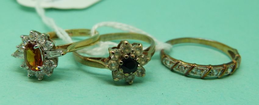 Three 9ct gold rings, one set with a sapphire