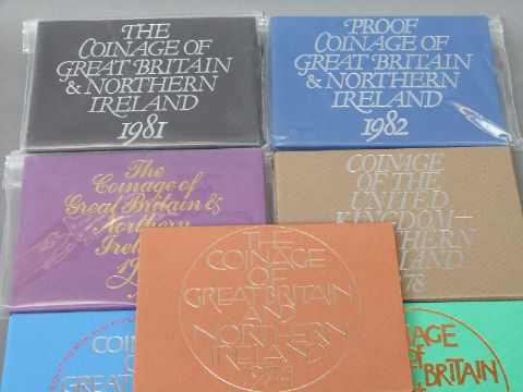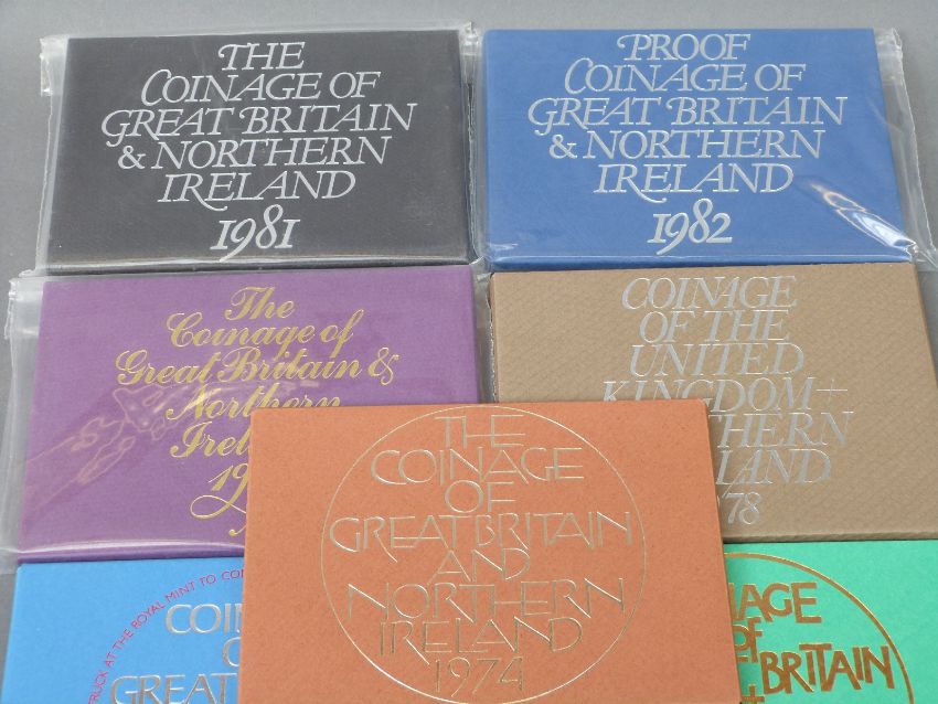 Nine Royal Mint coinage of Great Britain and Northern Ireland sets including commemorative examples 1970-1982, together with a 1983 deluxe set