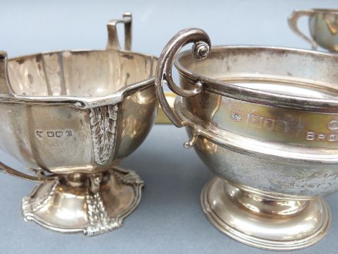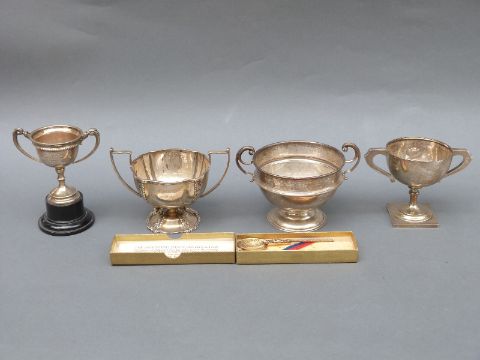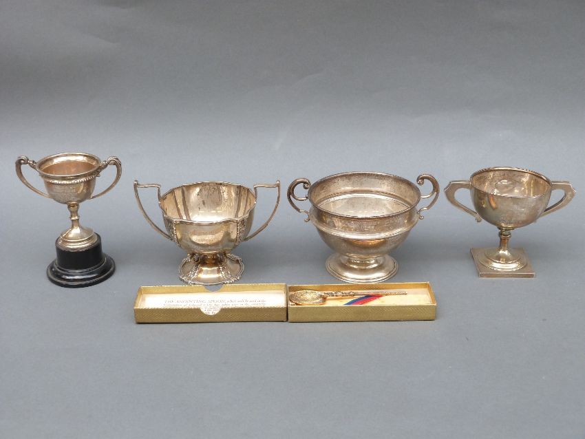 Four various mid 20thC hallmarked silver twin handled trophy cups including Ludlow Golf Club, width 14cm and a hallmarked silver spoon, weight of silver 501g