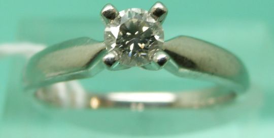 A platinum ring set with a round brilliant cut diamond (size M)